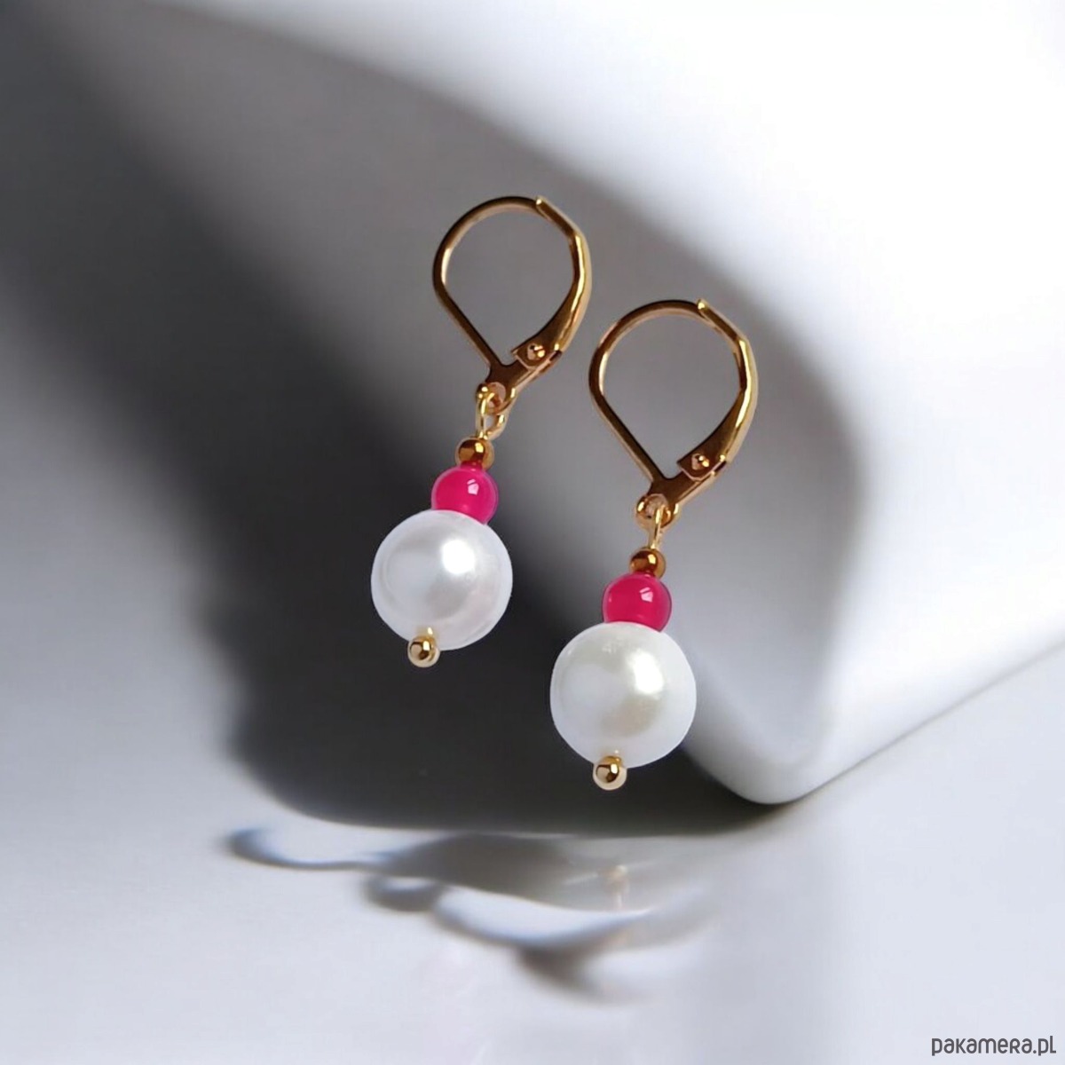 Proste, ale bardzo atrakcyjne kolczyki wykonane ze sporych, naturalnych pereł słodkowodnych (ok.9mm) oraz agatu w intensywnym fuksjowym kolorze (ok.3,5mm)