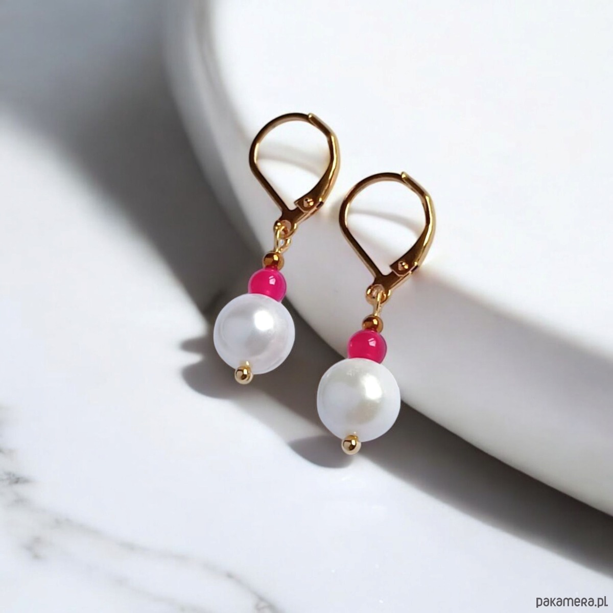 Proste, ale bardzo atrakcyjne kolczyki wykonane ze sporych, naturalnych pereł słodkowodnych (ok.9mm) oraz agatu w intensywnym fuksjowym kolorze (ok.3,5mm)