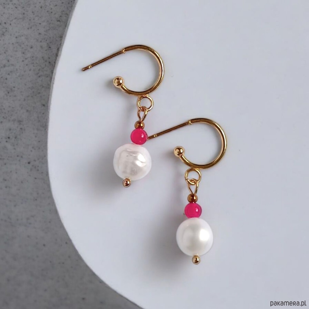 Proste, ale bardzo atrakcyjne kolczyki wykonane ze sporych, naturalnych pereł słodkowodnych (ok.9mm) oraz agatu w intensywnym fuksjowym kolorze (ok.3,5mm)