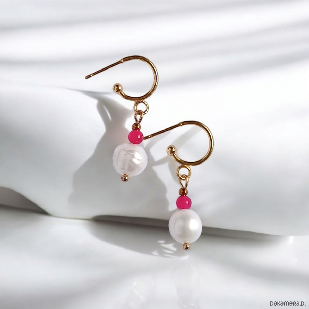 Proste, ale bardzo atrakcyjne kolczyki wykonane ze sporych, naturalnych pereł słodkowodnych (ok.9mm) oraz agatu w intensywnym fuksjowym kolorze (ok.3,5mm)