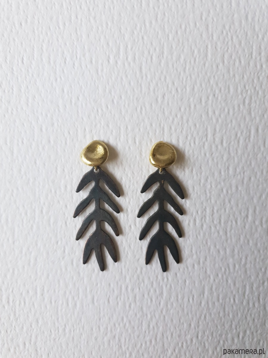 Oryginalne, wiszące kolczyki z kolekcji GARDEN OF EDEN z motywem roślinnym. Tworzone ręcznie z surowego i oksydowanego na szaro mosiądzu (ręcznie wycinane, matowione, szczotkowane, oksydowane) Sztyfty ze stali chirurgicznej. Kolczyki są bardzo lekkie.
