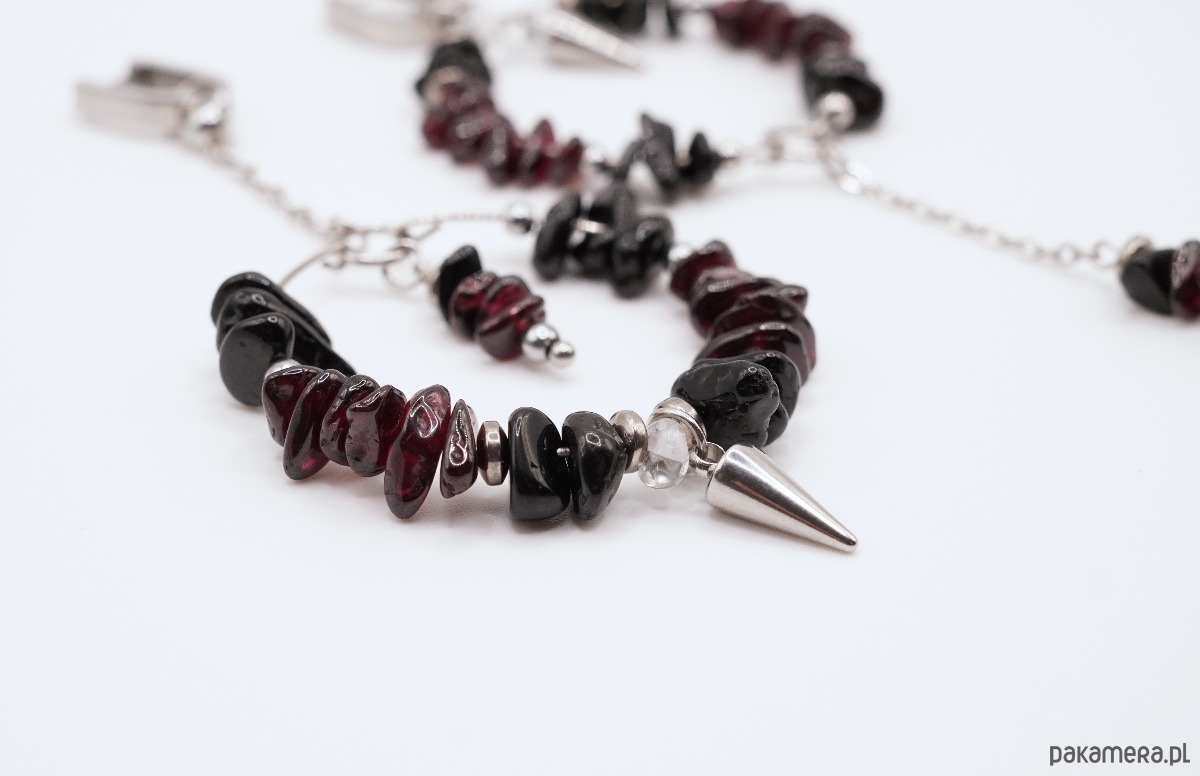 Miks kamieni: Głęboki, winny granat i czerń turmalinu tworzą dramatyczny kontrast, który doskonale dopełniają czyste refleksy górskiego kryształu.