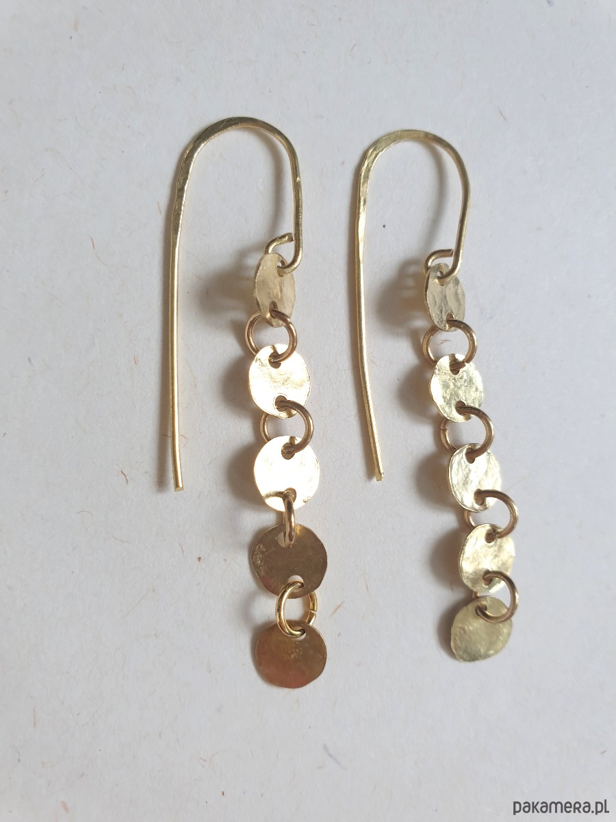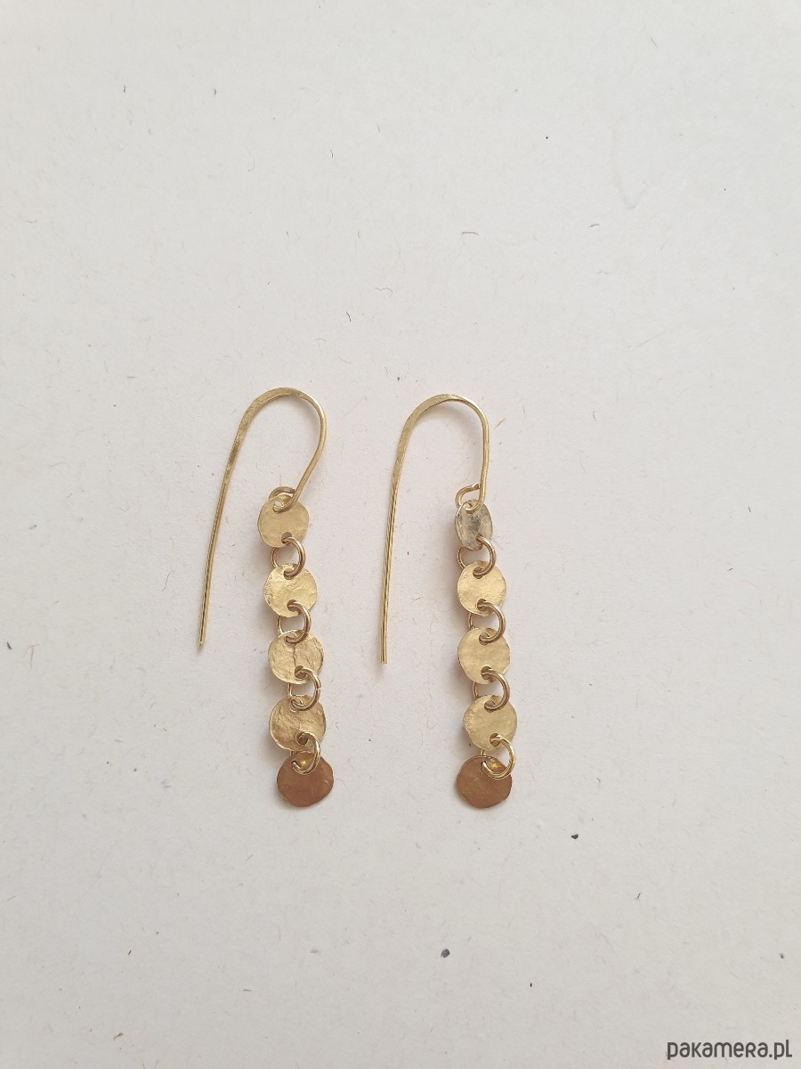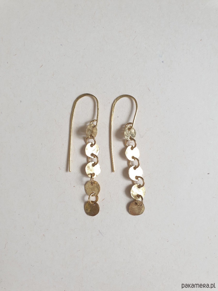 Minimalistyczne wiszące kolczyki z kolekcji GEOMETRIA Tworzone ręcznie z surowego mosiądzu (ręcznie wycinane, młotkowane) z okrągłymi blaszkami, błyszczące jak złoto :) Kolekcja inspirowana starożytnymi mozaikami, neolitycznymi płaskorzeźbami i starymi rycinami