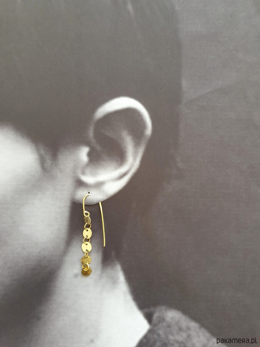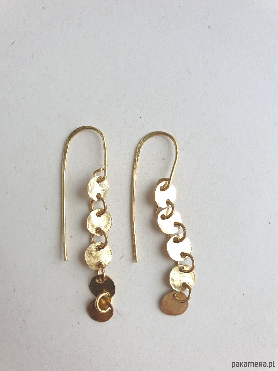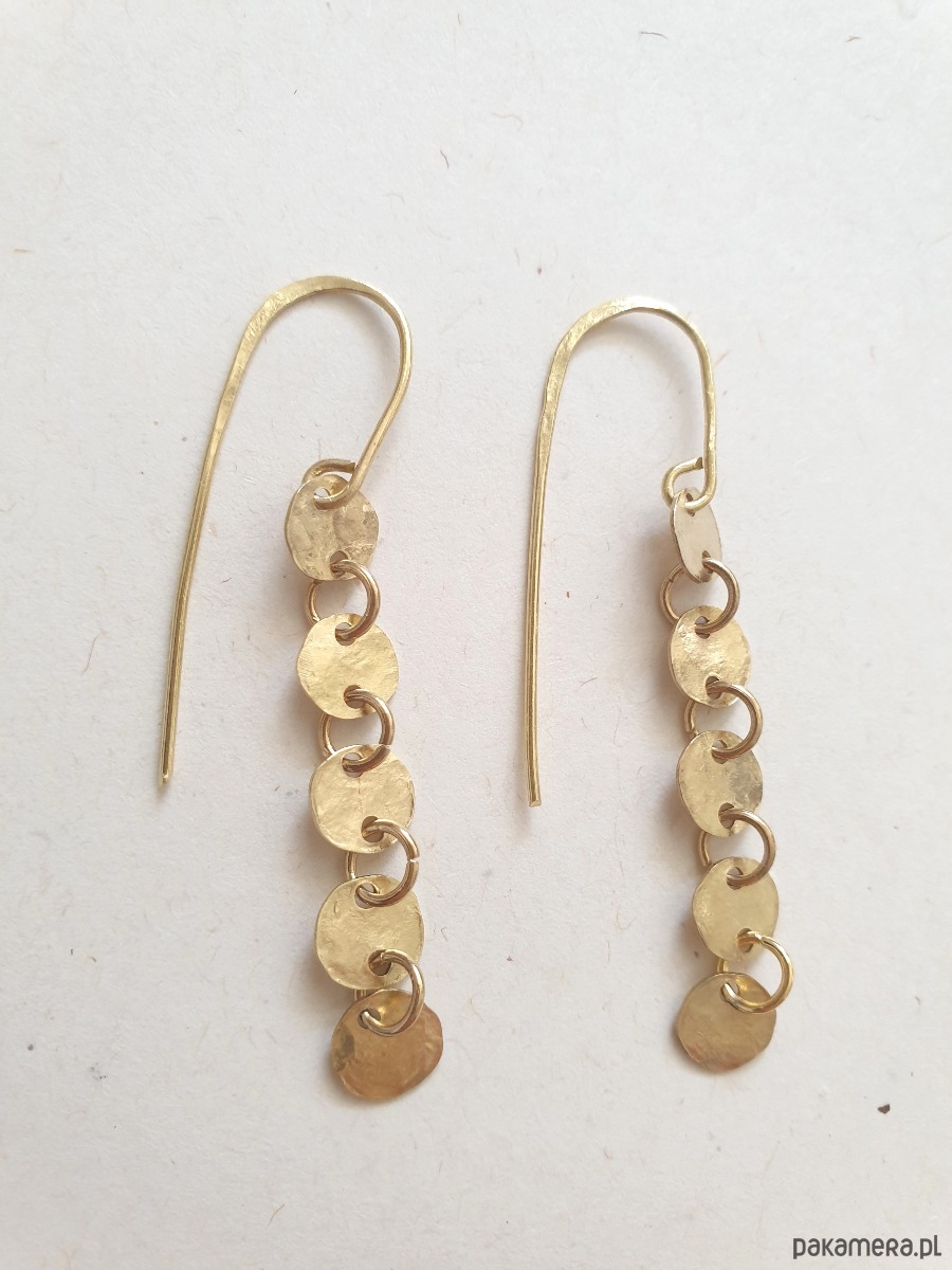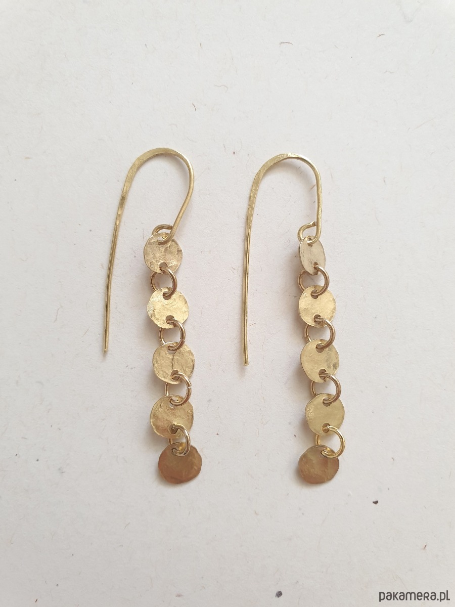 Minimalistyczne wiszące kolczyki z kolekcji GEOMETRIA Tworzone ręcznie z surowego mosiądzu (ręcznie wycinane, młotkowane) z okrągłymi blaszkami, błyszczące jak złoto :) Kolekcja inspirowana starożytnymi mozaikami, neolitycznymi płaskorzeźbami i starymi rycinami