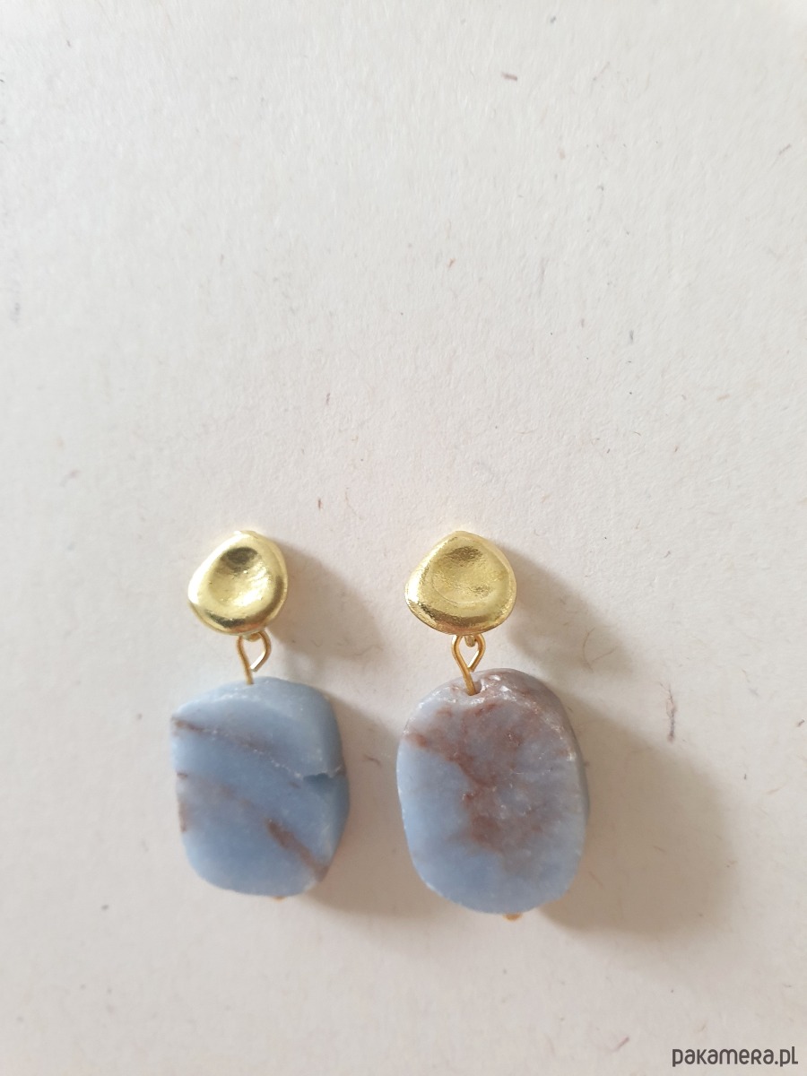 Minimalistyczne delikatne kolczyki wiszące z nieregularnym geometrycznym owalem angelitem, oraz sztyftem z surowego mosiądzu (z tyłu sztyft ze stali szlachetnej i zatyczka stal złocona). Kolczyki tworzone na zamówienie, z tych samych kamieni ale mogą się minimalnie różnić ze względu na to że każdy kamień jest wyjątkowy