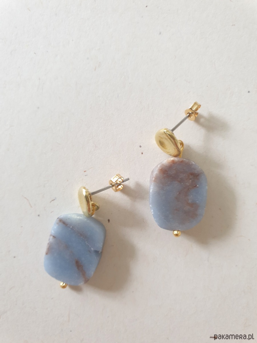 Minimalistyczne delikatne kolczyki wiszące z nieregularnym geometrycznym owalem angelitem, oraz sztyftem z surowego mosiądzu (z tyłu sztyft ze stali szlachetnej i zatyczka stal złocona). Kolczyki tworzone na zamówienie, z tych samych kamieni ale mogą się minimalnie różnić ze względu na to że każdy kamień jest wyjątkowy