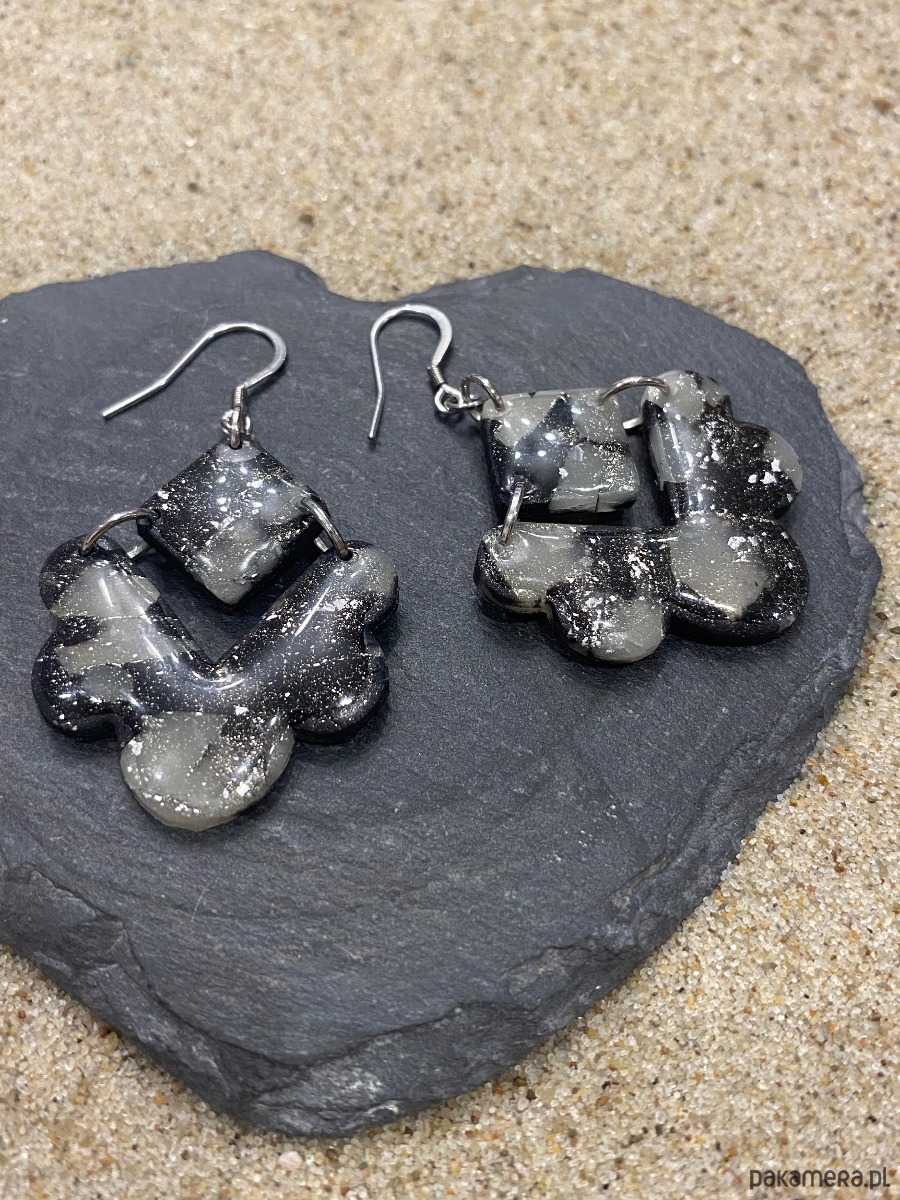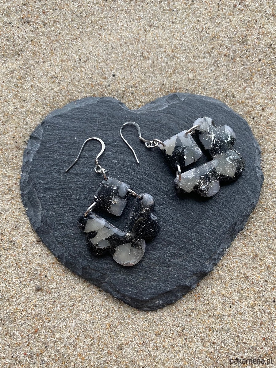 Ręcznie wykonane kolczyki o geometrycznej formie, w odcieniach czerni i szarości z delikatnym, mineralnym połyskiem. Każdy element jest unikatowy – nieregularna struktura nadaje im surowego, nowoczesnego charakteru.
