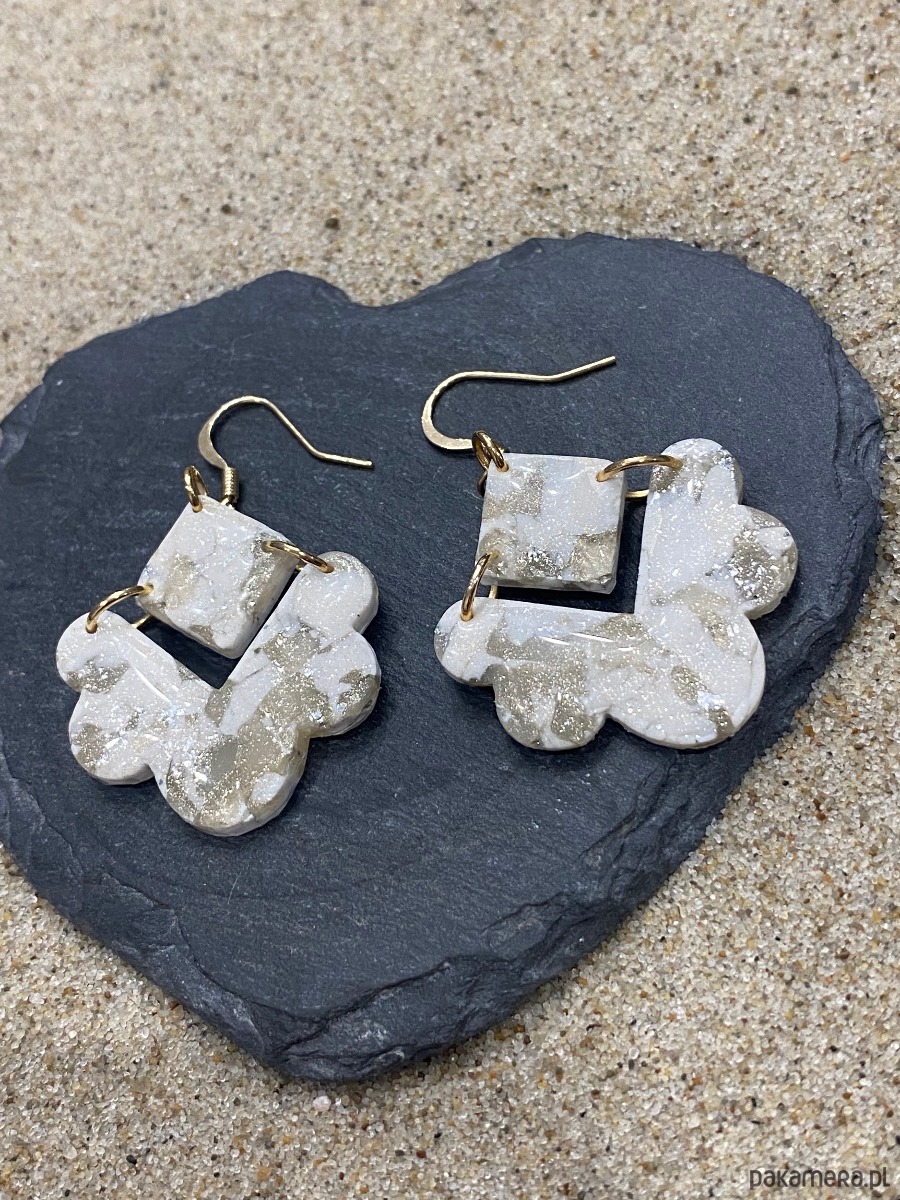 Kolczyki handmade w jasnej, naturalnej kolorystyce z subtelnymi złotymi drobinkami. Lekka forma i nieregularny kształt sprawiają, że są jednocześnie delikatne i wyraziste.