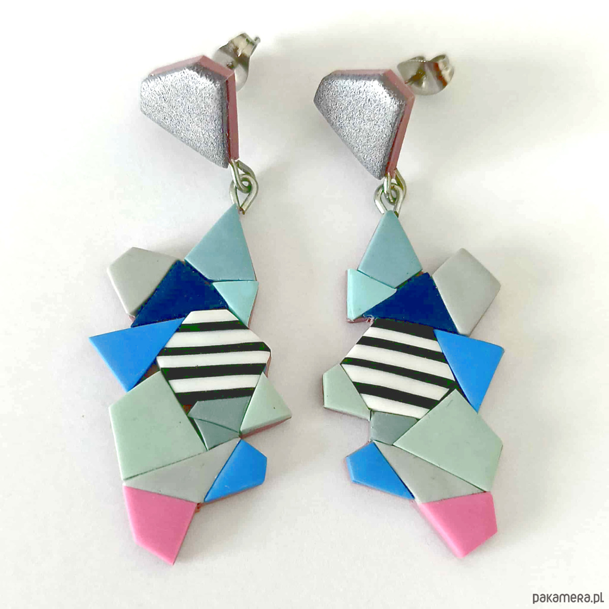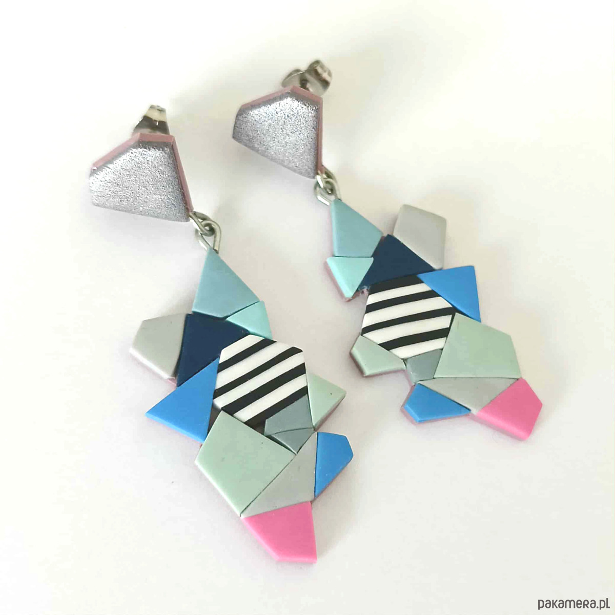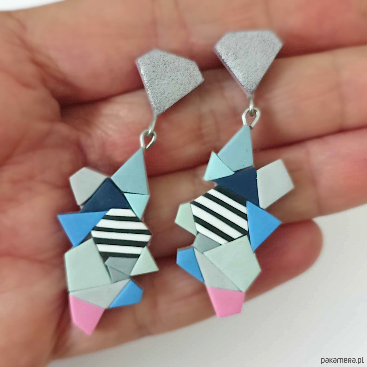 Ręcznie robione kolczyki z masy polimerowej w geometrycznym stylu. Połączenie pastelowego różu i błękitu z kontrastowym czarno-białym wzorem tworzy nowoczesny, artystyczny akcent do każdej stylizacji. Lekkie, wygodne i unikatowe – idealne dla osób, które lubią wyróżniać się dodatkami.