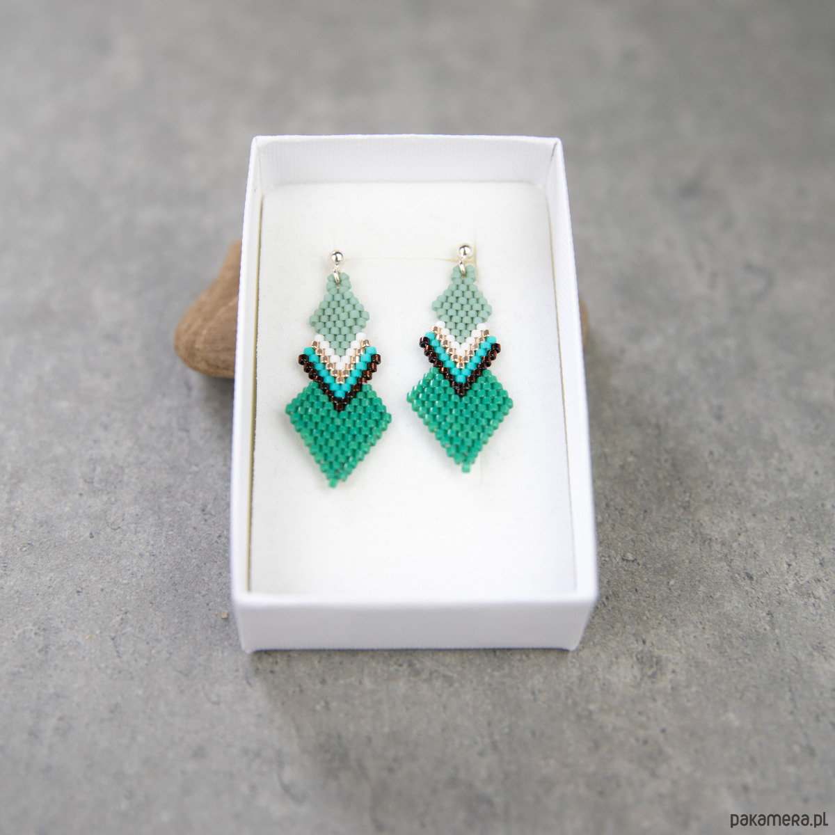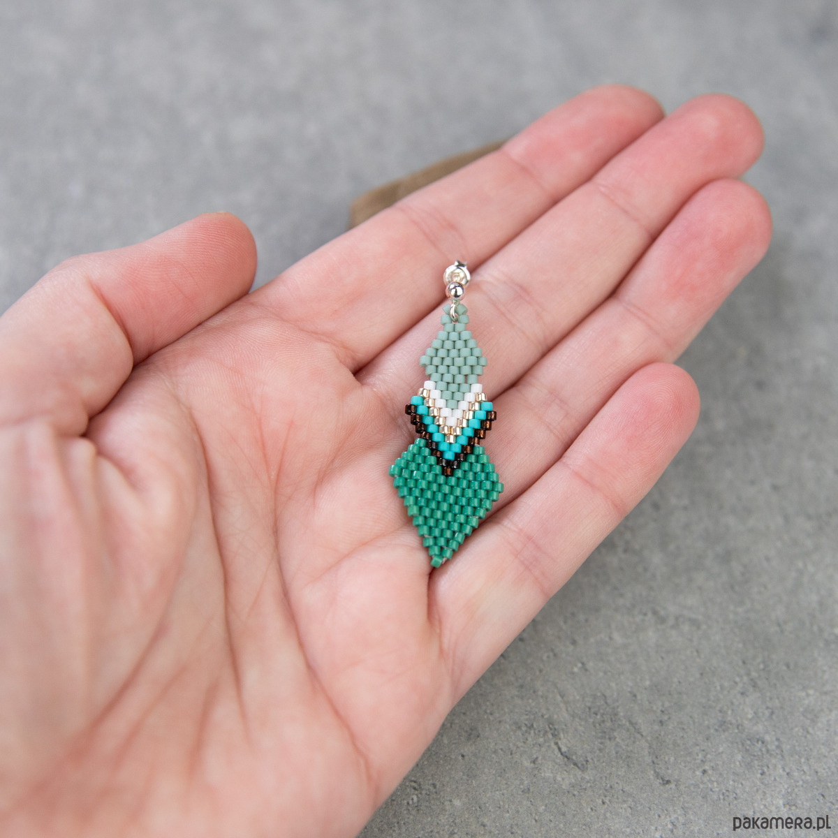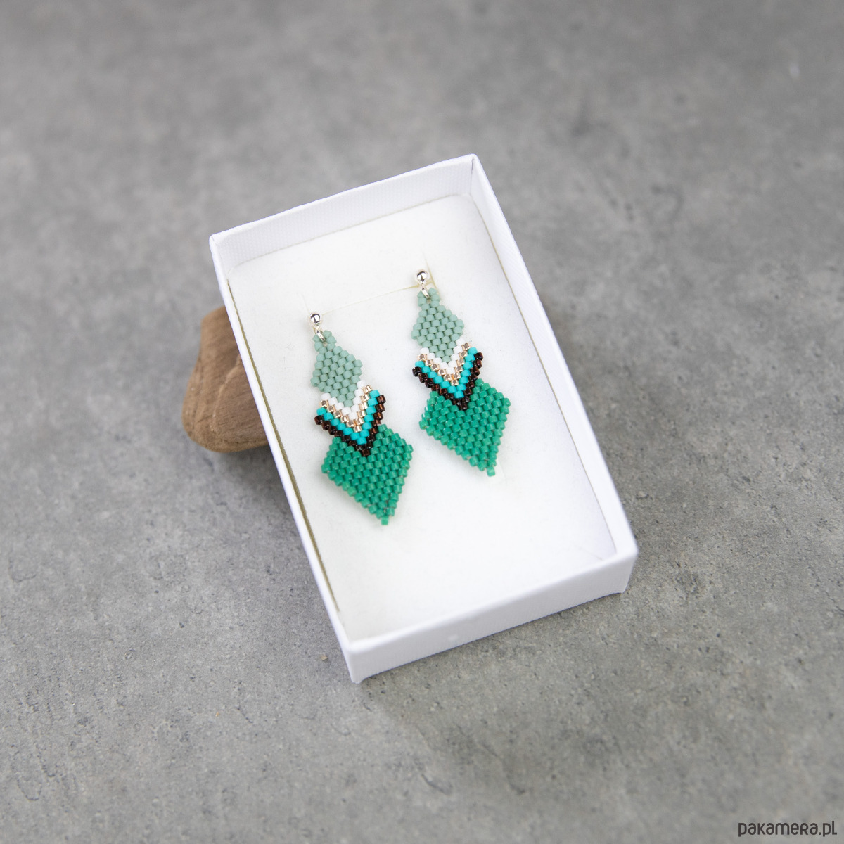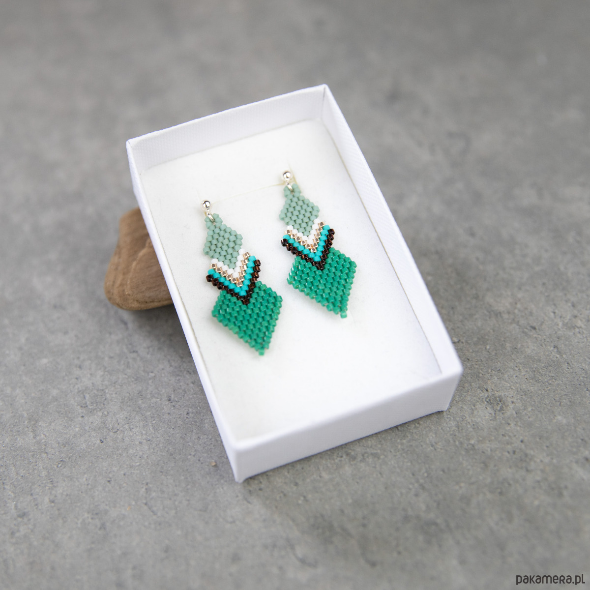 Kolczyki geometryczne w formie trzech rombów, wykonane ze szklanych koralików Miyuki. Kolory kolczyków: odcienie turkusu, biały, złoty, ciemny brąz.