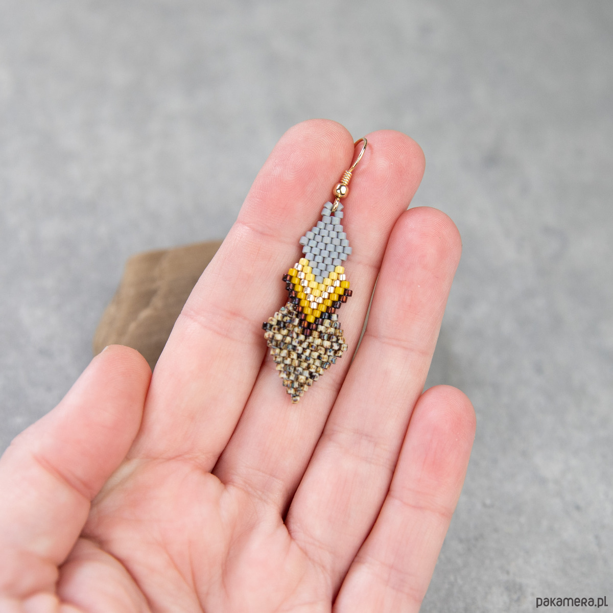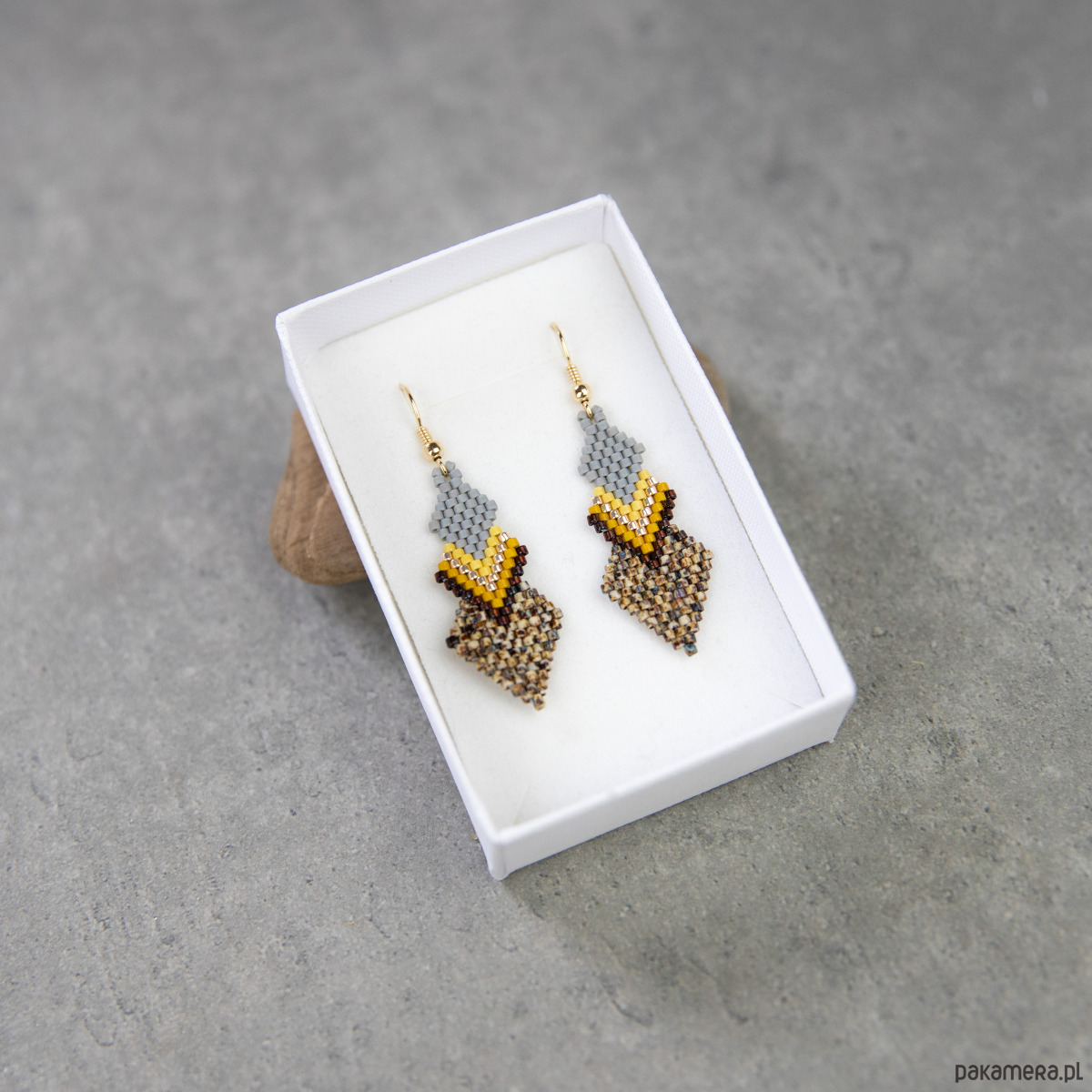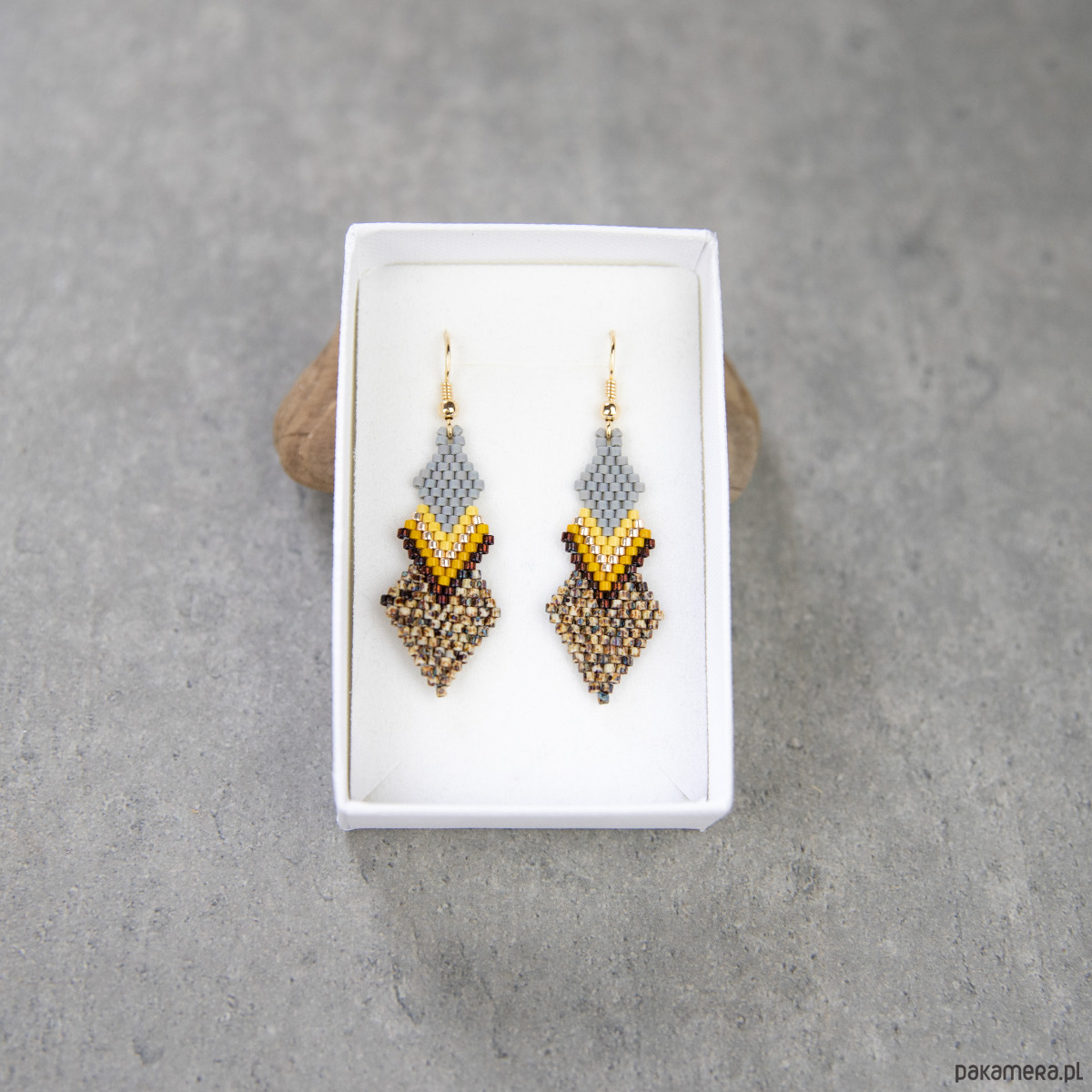 Kolczyki geometryczne w formie trzech rombów, wykonane ze szklanych koralików Miyuki. Kolory kolczyków: szary, żółty, złoty, musztardowy, brązowy.
