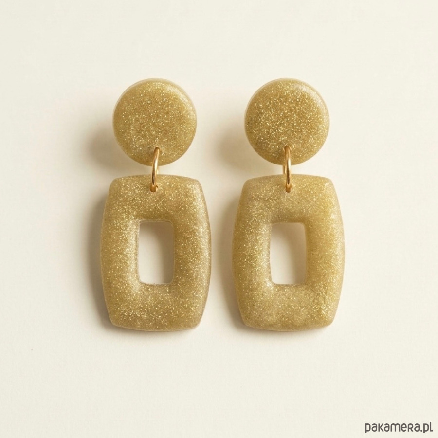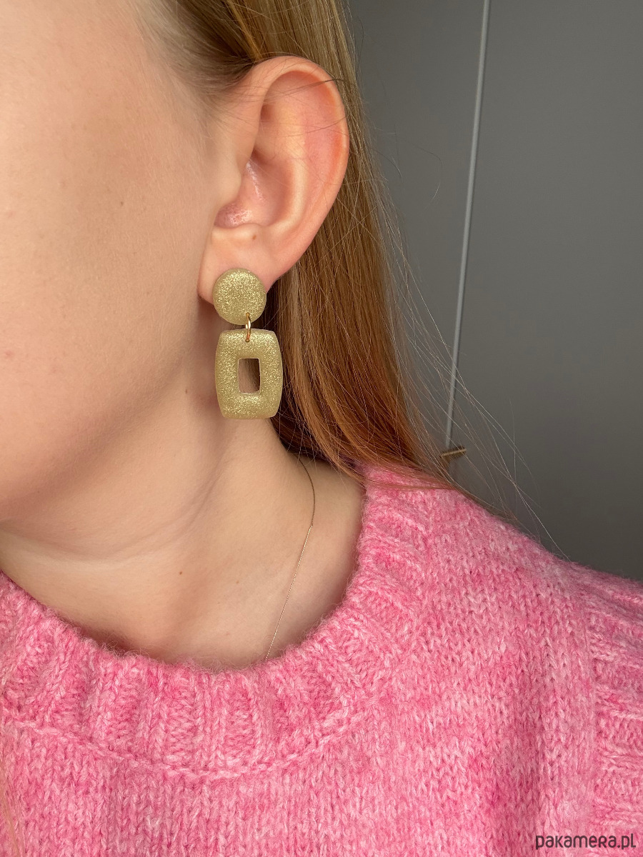 Nowoczesne kolczyki, wykonane ręcznie z lekkiej gliny polimerowej z brokatowymi drobinkami. Dzięki swojej lekkiej wadze oraz zastosowaniu sztyftów ze stali chirurgicznej, są niezwykle komfortowe w noszeniu i bezpieczne.