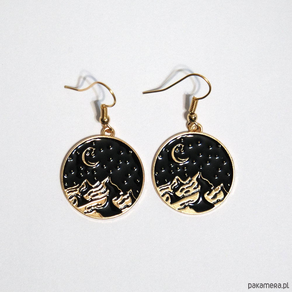 Kolczyki z pięknymi zawieszkami emaliowanymi z motywem gór nocą.