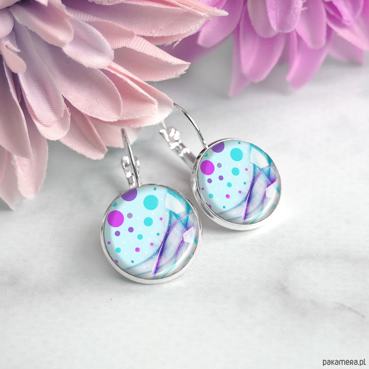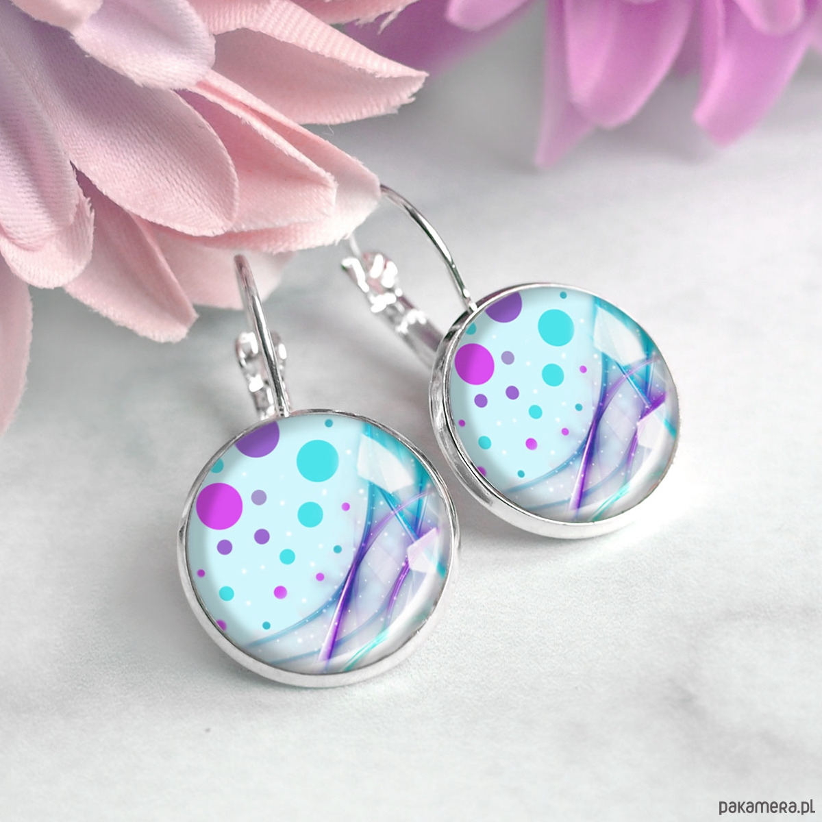 • Interesujące kolczyki zapinane, z grafiką artystyczną, zatopioną pod wypukłym szkiełkiem, dzięki któremu grafika nabiera trójwymiarowego wyrazu, w oprawie w kolorze srebrnym.