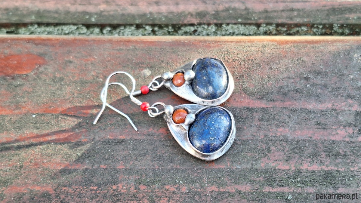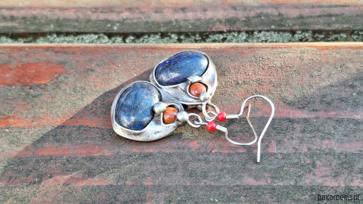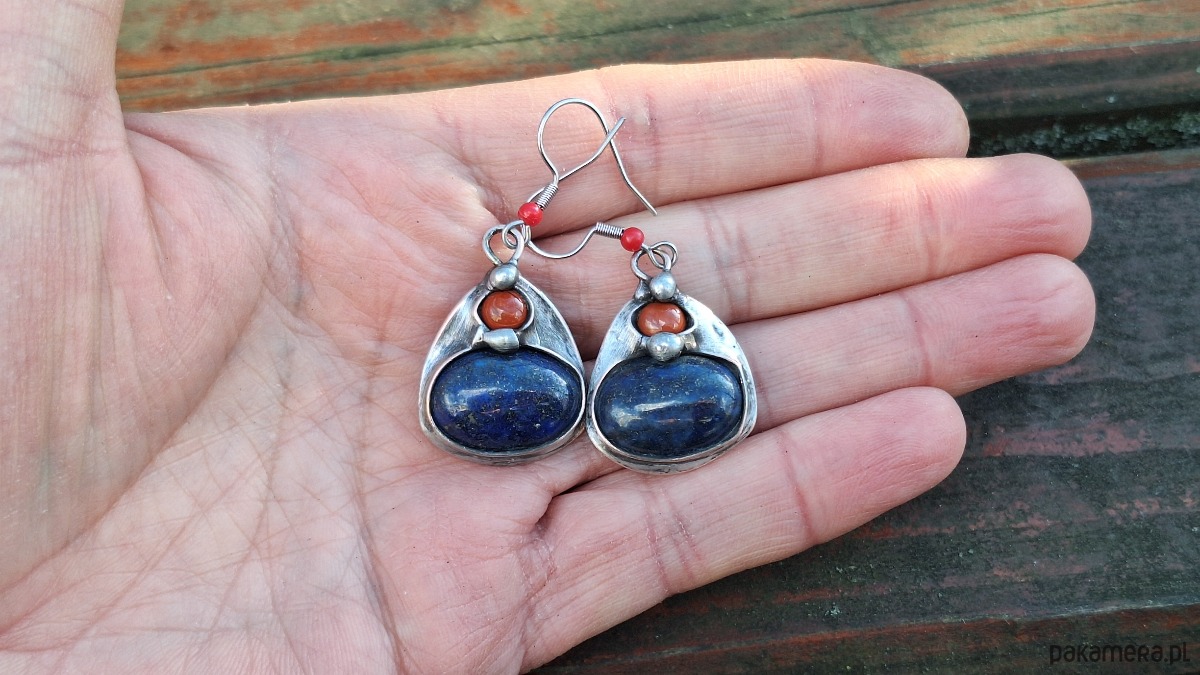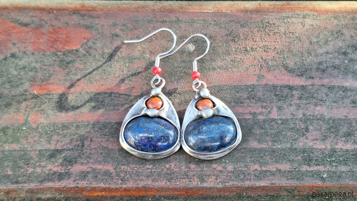 Kolczyki wykonane z miedzi, cyny, jaspisów i lapis lazuli. Długość z biglem ok. 4.5 cm, szerokość ok. 2 cm. Bigle metalowe.