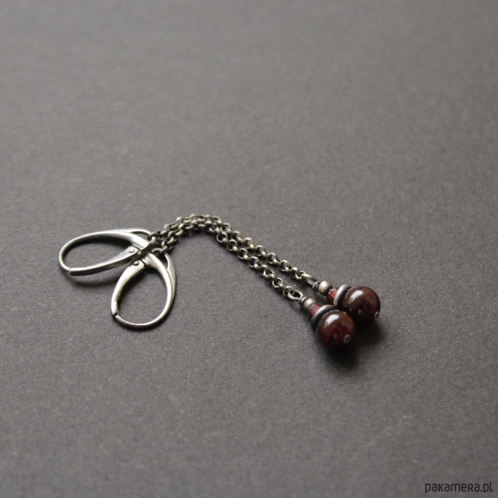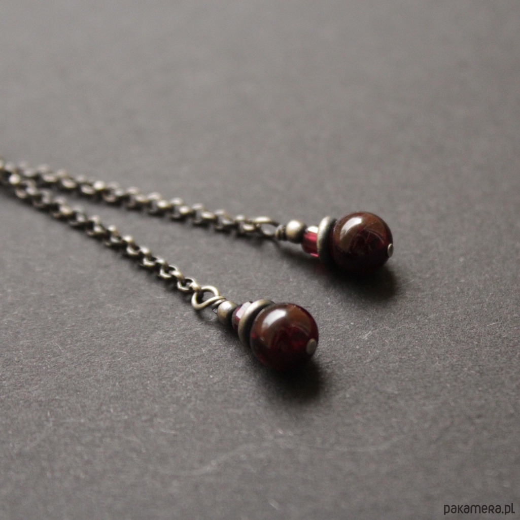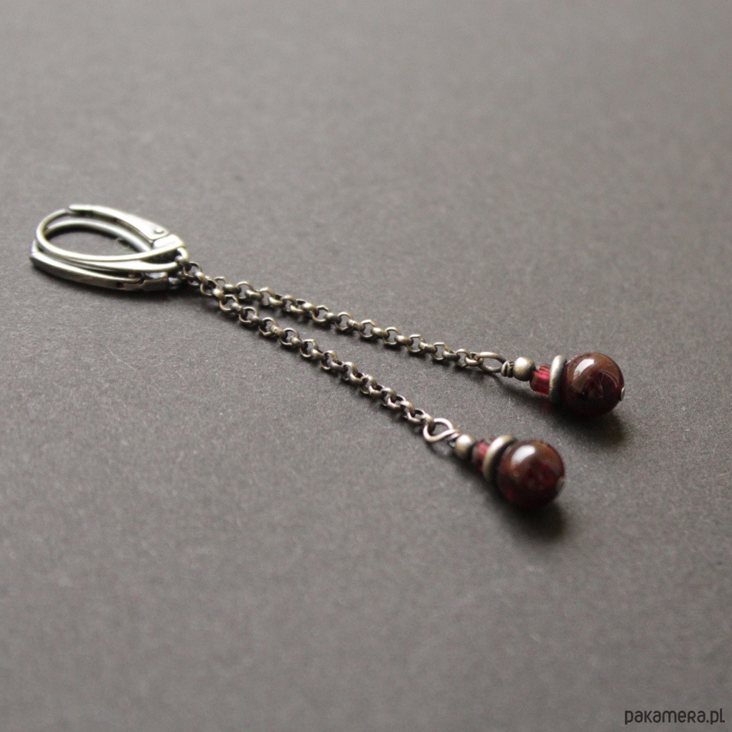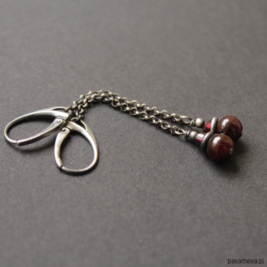 Kolczyki wykonane zostały z oksydowanego srebra próby 925 oraz pięknych kul granatów wielkości 0,7 cm w towarzystwie fasetowanych kosteczek granatów wielkści 0,3 cm.