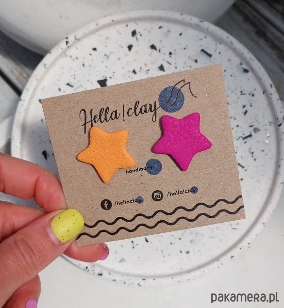 Oryginalne kolczyki wykonane ręcznie z dbałością o szczegóły z profesjonalnej glinki polimerowej, wypalane w piecu i szlifowane w domowej pracowni. Każda para kolczyków jest niepowtarzalna i wyjątkowa. Kolczyki są bardzo lekkie i wygodne, nie obciążają płatka ucha i przyciągają spojrzenia. Zapinane na sztyft ze stali chirurgicznej.