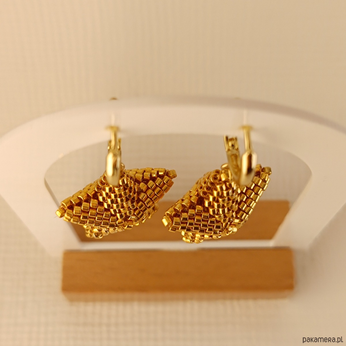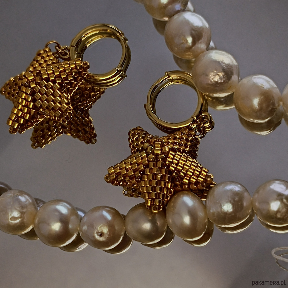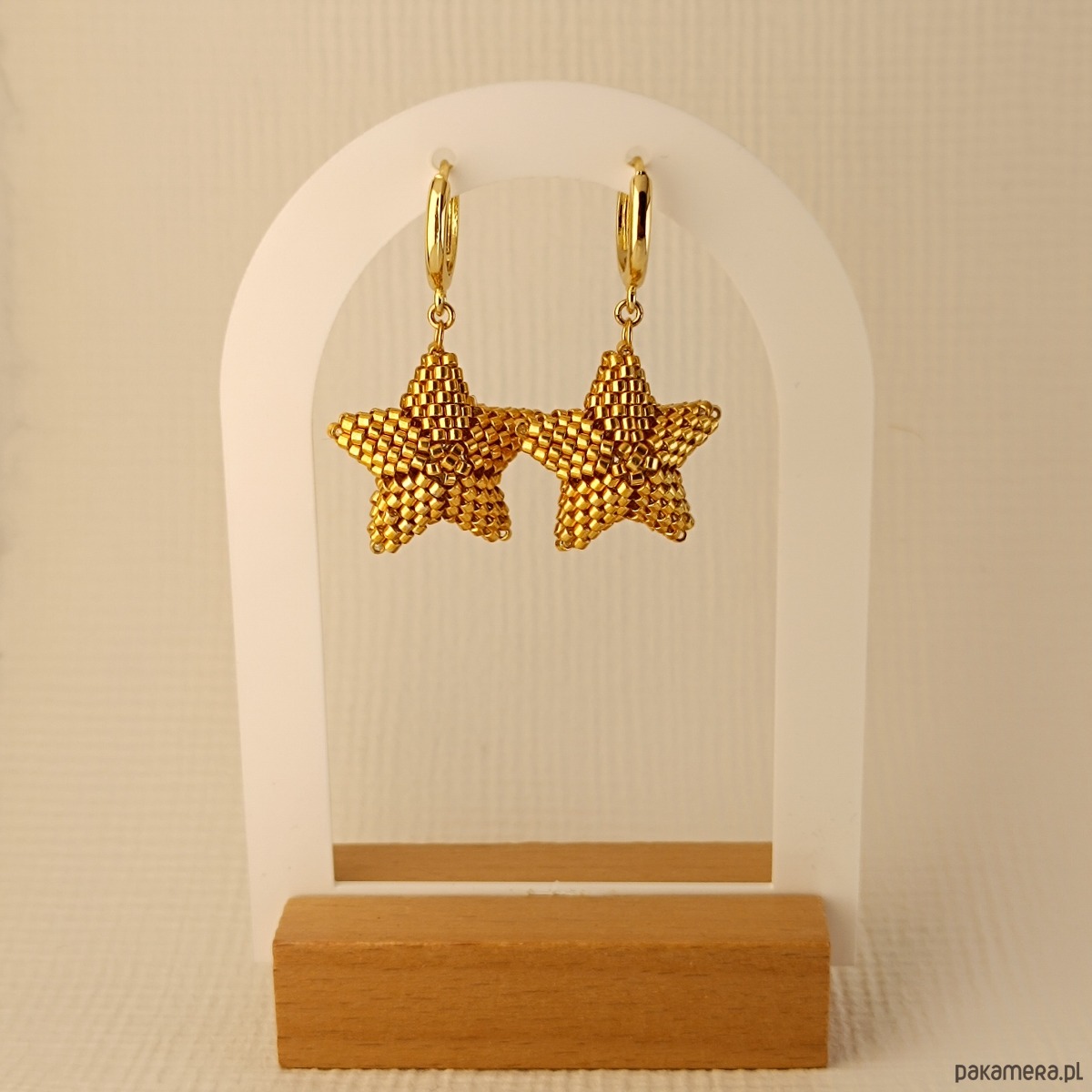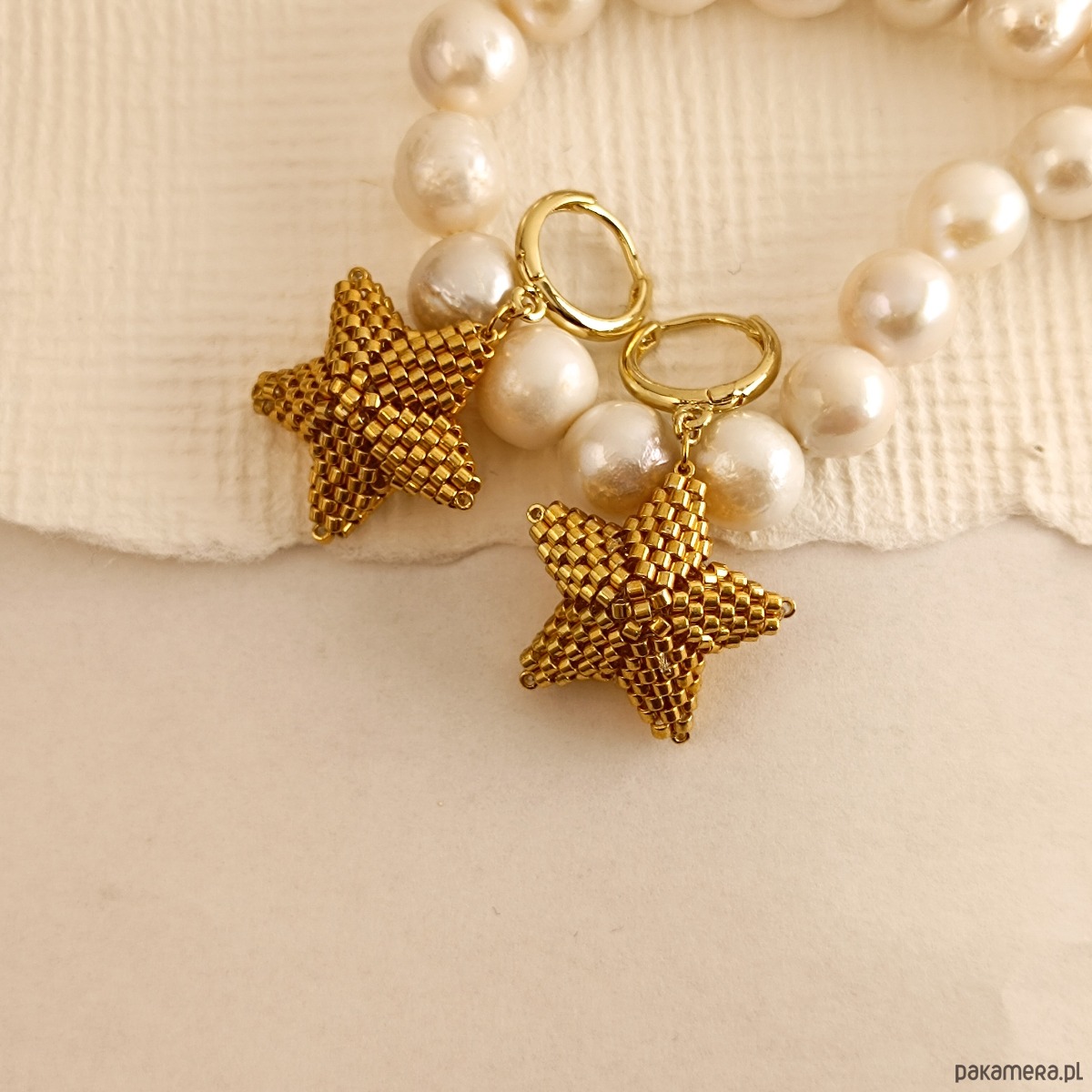 Rozświetl swoje stylizacje tymi zachwycającymi kolczykami w kształcie gwiazd, wykonanymi z najwyższej jakości japońskich koralików Miyuki pokrytych złotem. Ręczna praca i perfekcyjna dbałość o detale sprawiają, że te kolczyki to prawdziwe dzieło sztuki. Ich trójwymiarowa forma pięknie odbija światło, dodając blasku każdej okazji.