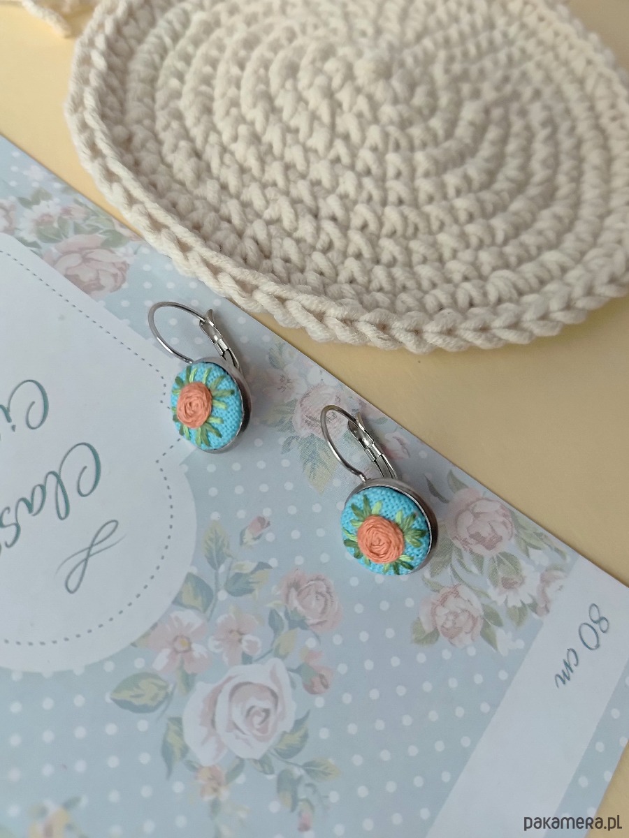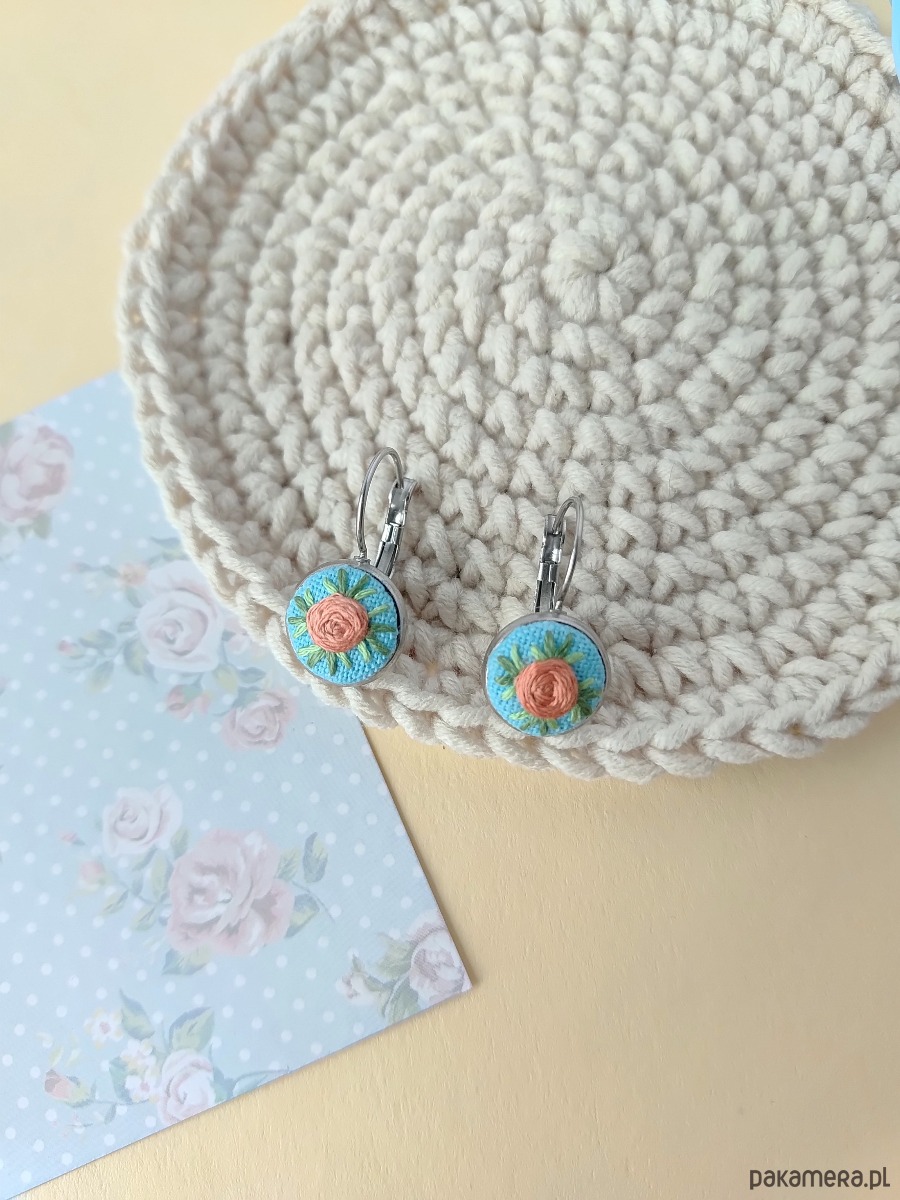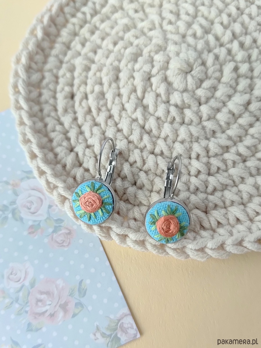 Te urocze kolczyki to jak dwa letnie poranki uchwycone w hafcie. Maleńkie różyczki w pastelowych barwach zostały wyhaftowane ręcznie, z użyciem bawełnianych nici muliny, na tle błękitnego nieba.