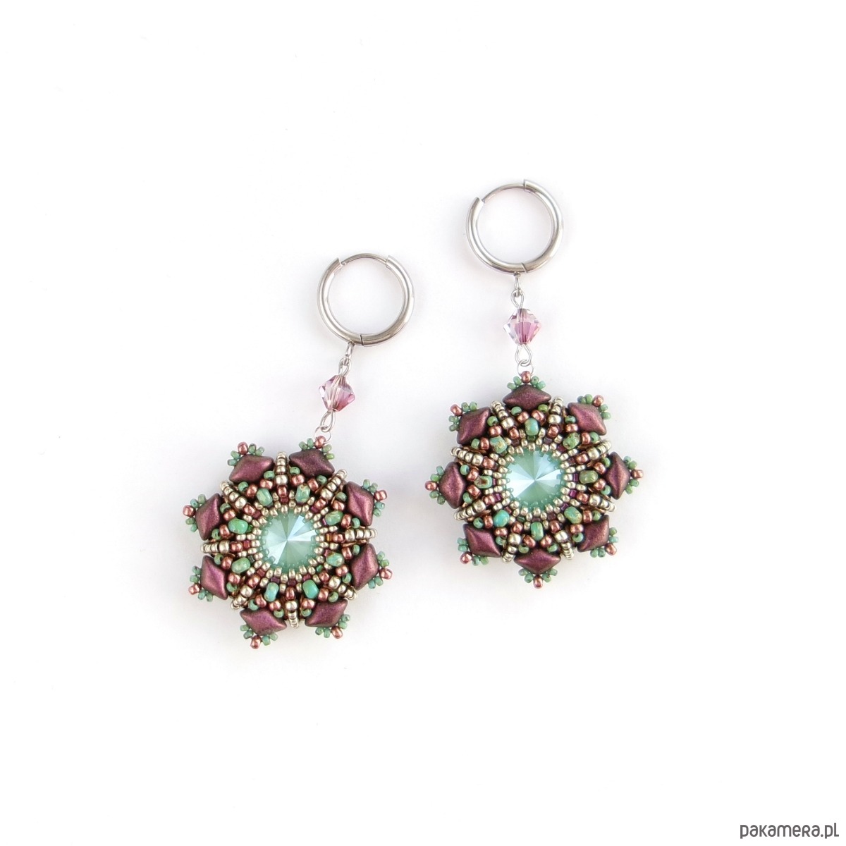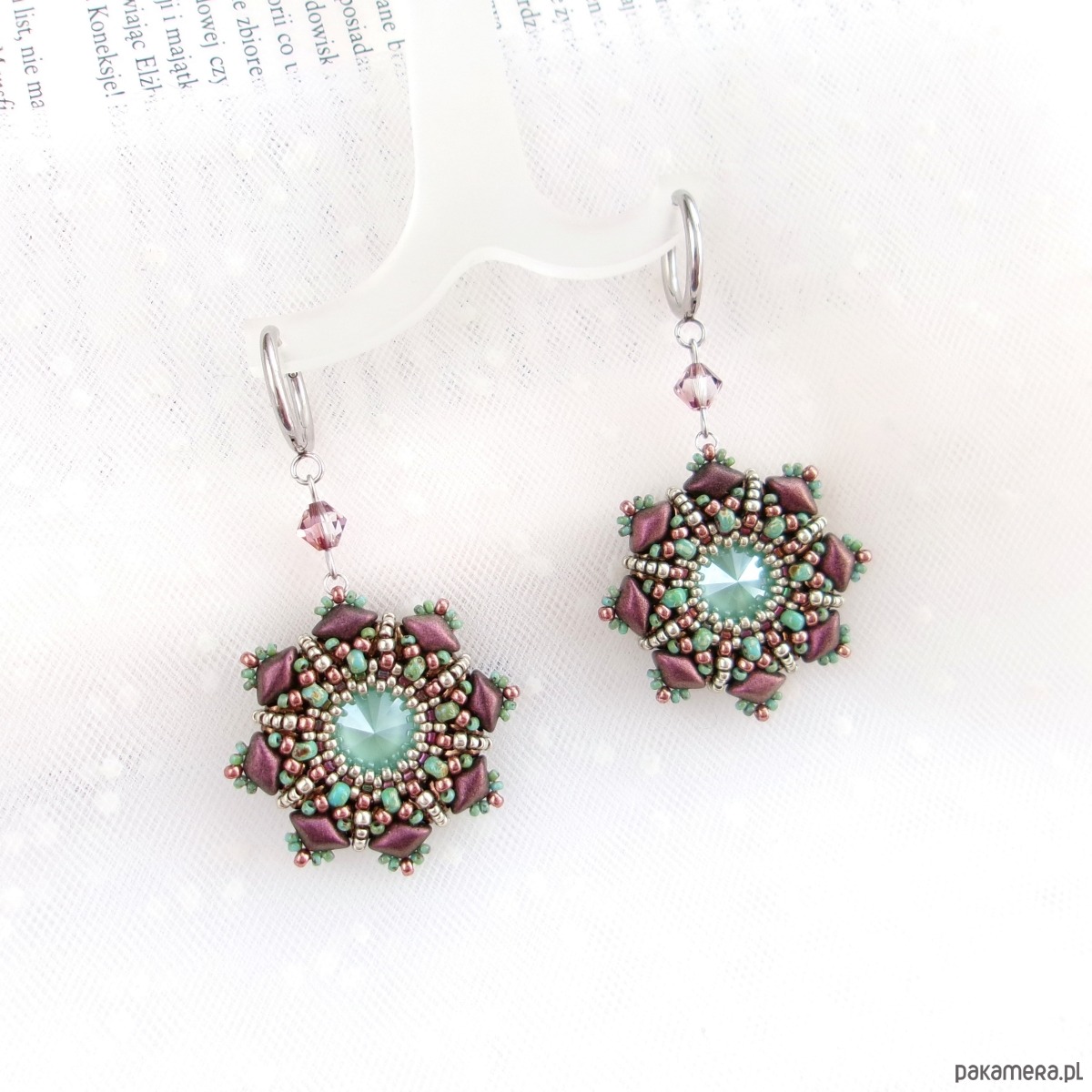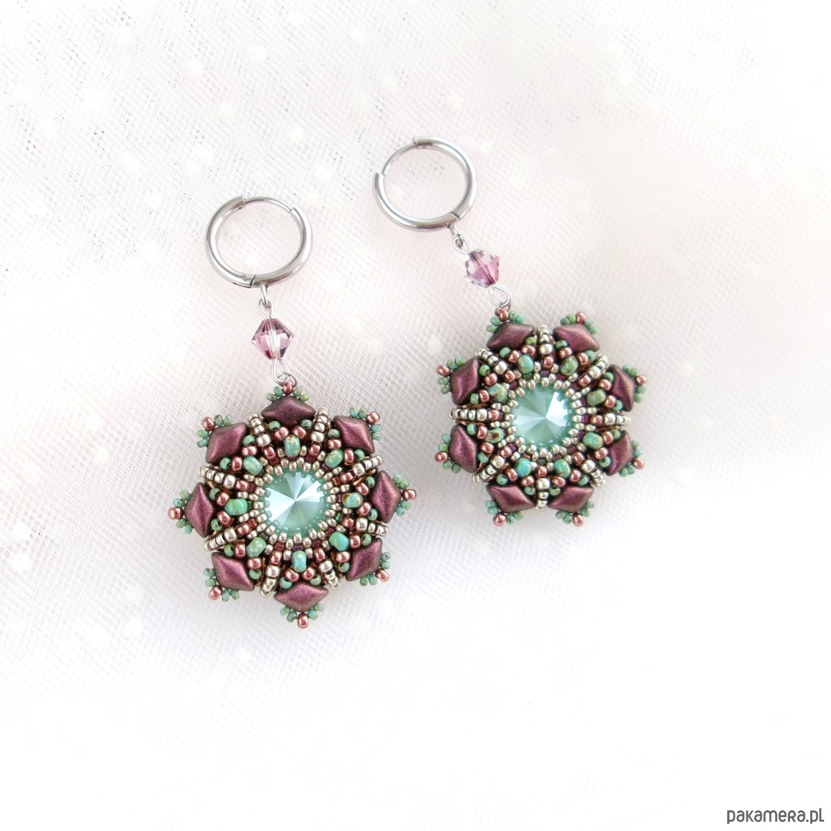 Unikalne kolczyki z kryształkami Swarovski w kolorach mięty, srebra i śliwki.