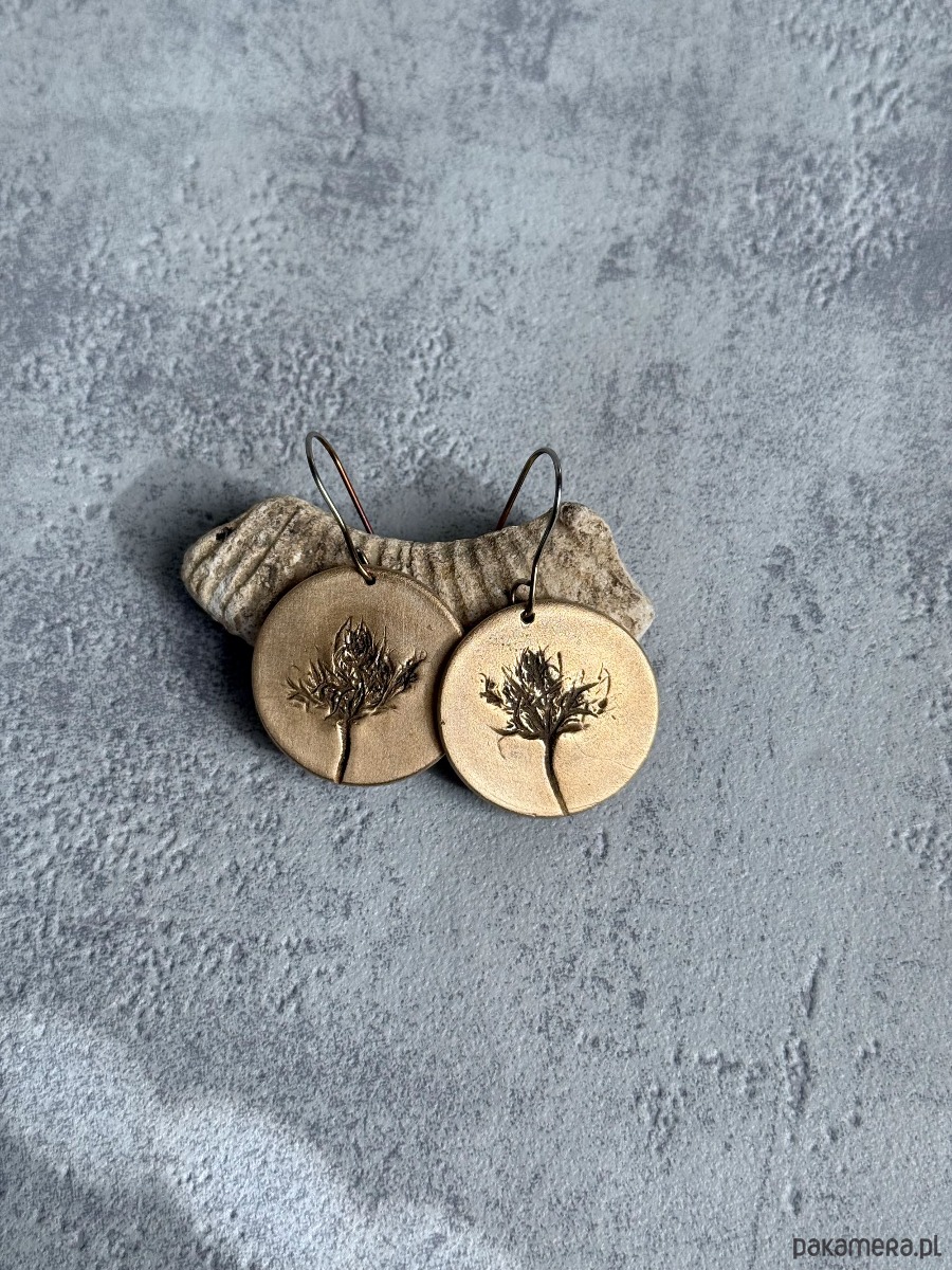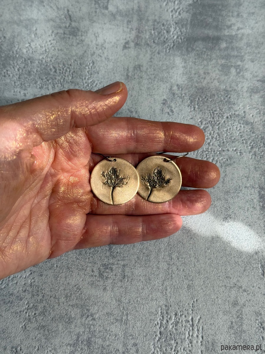 Unikatowe kolczyki z brązu z odciskiem prawdziwej rośliny.