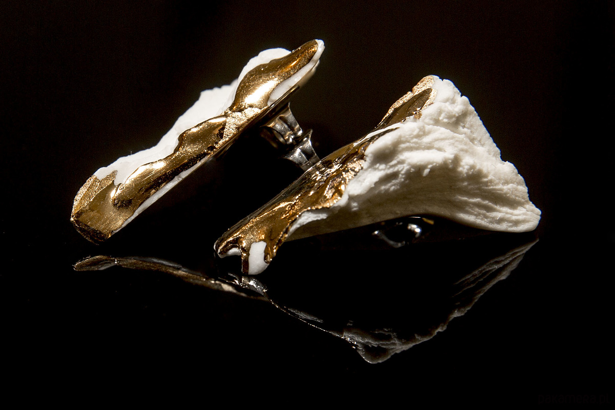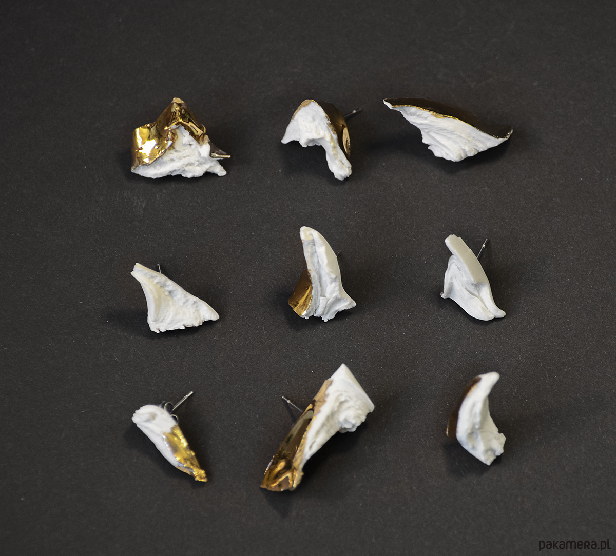 Te porcelanowe kolczyki są inspirowane niezwykłym lodowcem Perito Moreno, znajdującym się w Patagonii. Ich surowa biel wzbogacona jest subtelnymi smugami złota, które odbijają światło, przykuwając spojrzenia innych. Mają asymetryczny i nieregularny kształt, co czyni je unikatowymi. Każda para jest inna, co wynika z naturalnego przełamu porcelany i moich twórczych poszukiwań. Idąc pod prysznic i kładąc się do łóżka, najlepiej zostawić je na toaletce.