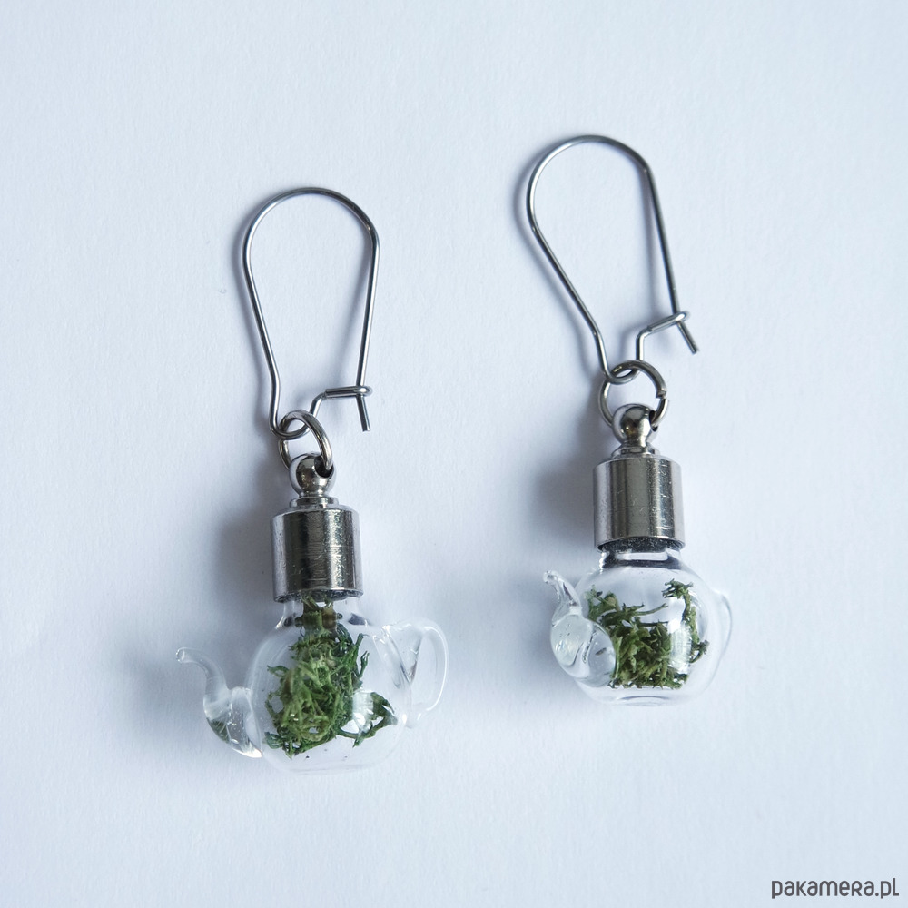 Unikatowe kolczyki z mchem umieszczonym w szklanych malutkich imbrykach o średnicy ok. 1,5 cm.