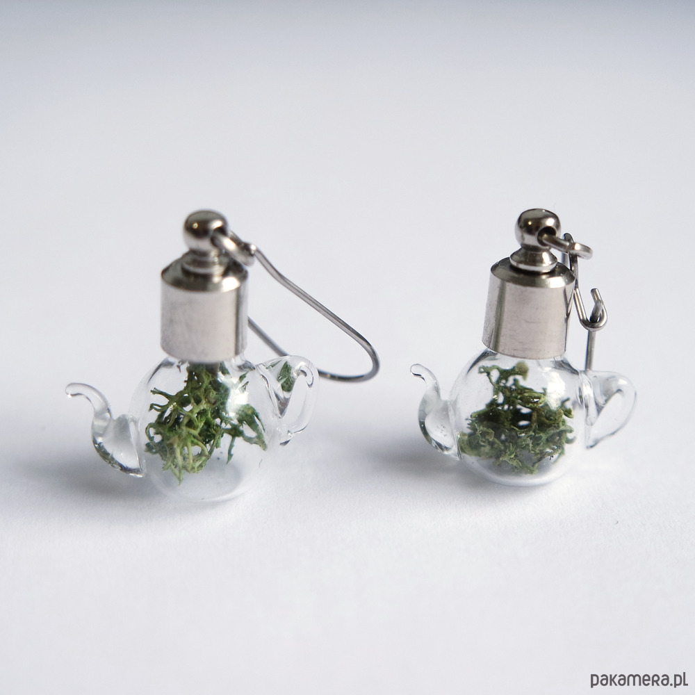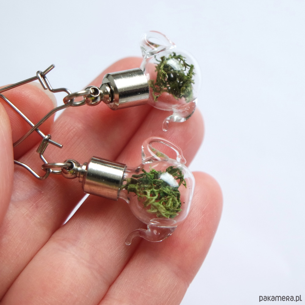 Unikatowe kolczyki z mchem umieszczonym w szklanych malutkich imbrykach o średnicy ok. 1,5 cm.