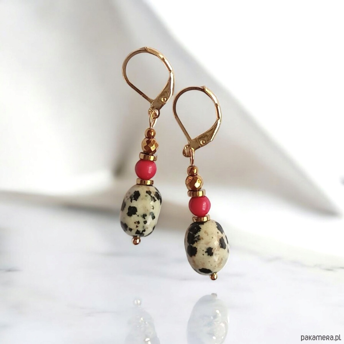 Wykonane z połączenia jaspisu dalmatyńskiego (nieregularne, polerowanie bryłki ok.11mm) , czerwonego korala 5mm oraz przekładek ze złotego hematytu.