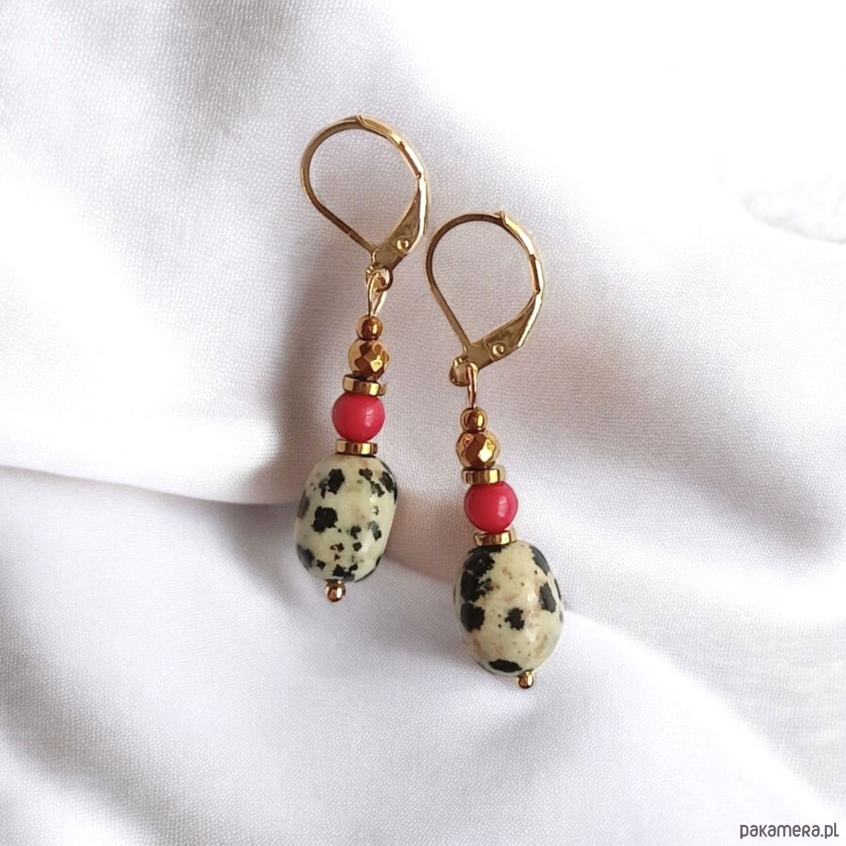 Wykonane z połączenia jaspisu dalmatyńskiego (nieregularne, polerowanie bryłki ok.11mm) , czerwonego korala 5mm oraz przekładek ze złotego hematytu.