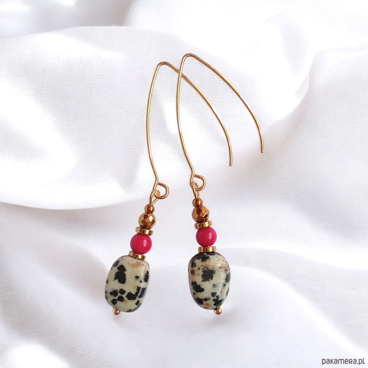 Wykonane z połączenia jaspisu dalmatyńskiego (nieregularne, polerowanie bryłki ok.11mm) , czerwonego korala 5mm oraz przekładek ze złotego hematytu.