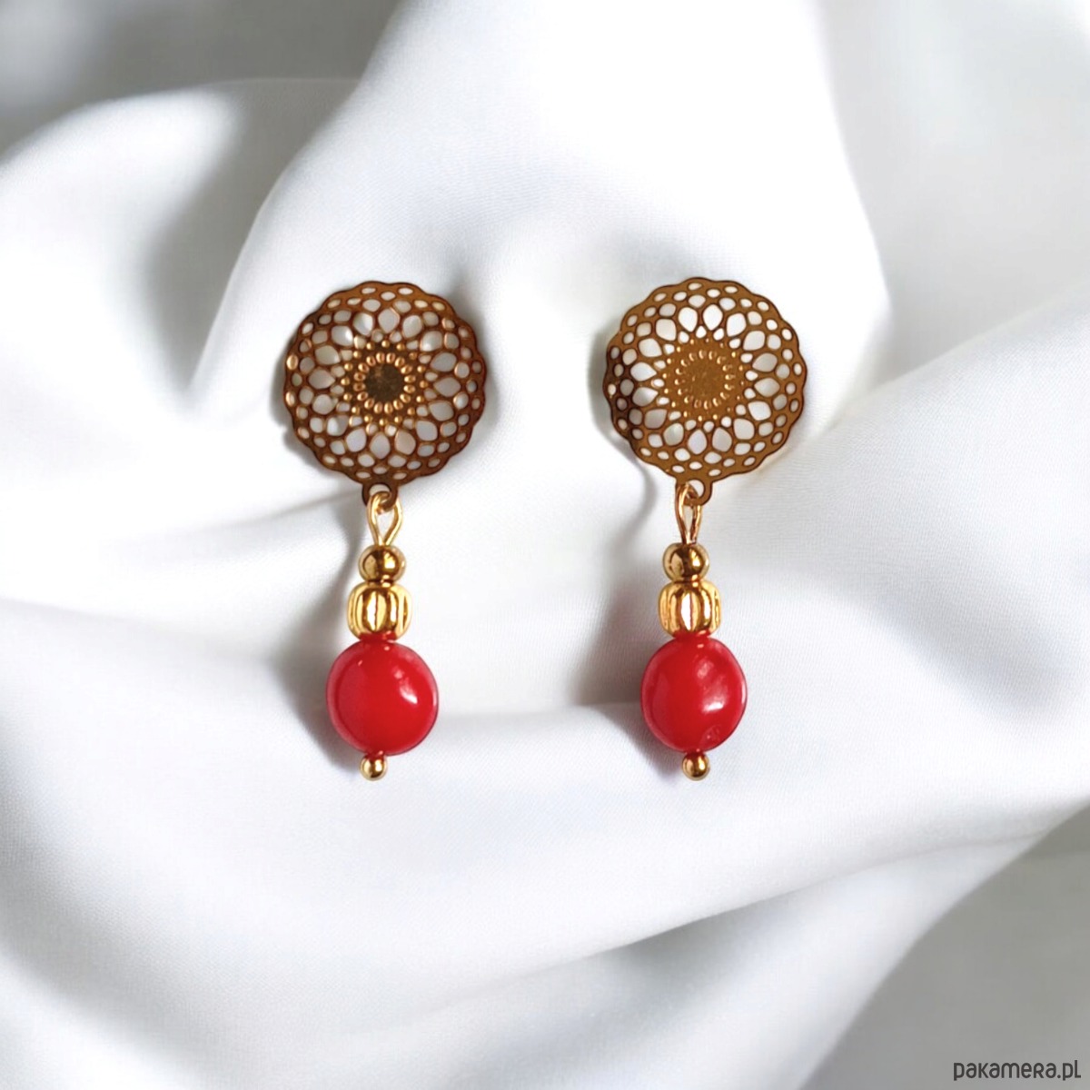 Kolczyki wykonane z czerwonego korala, złotego hematytu (przekładki) .