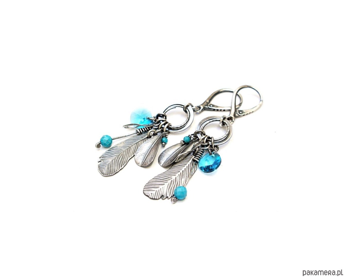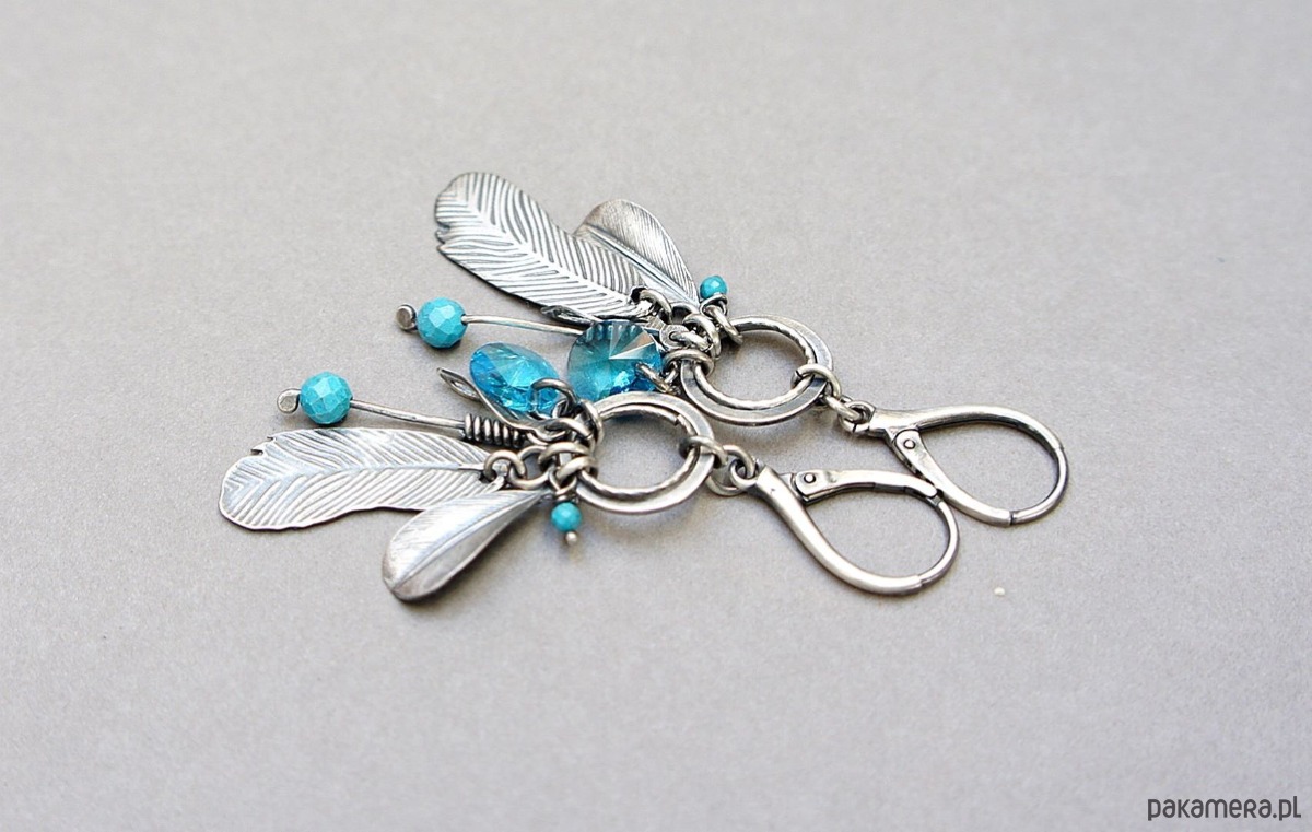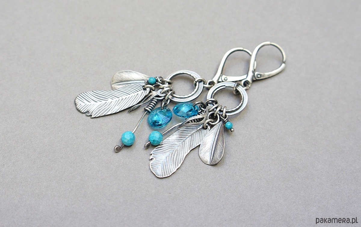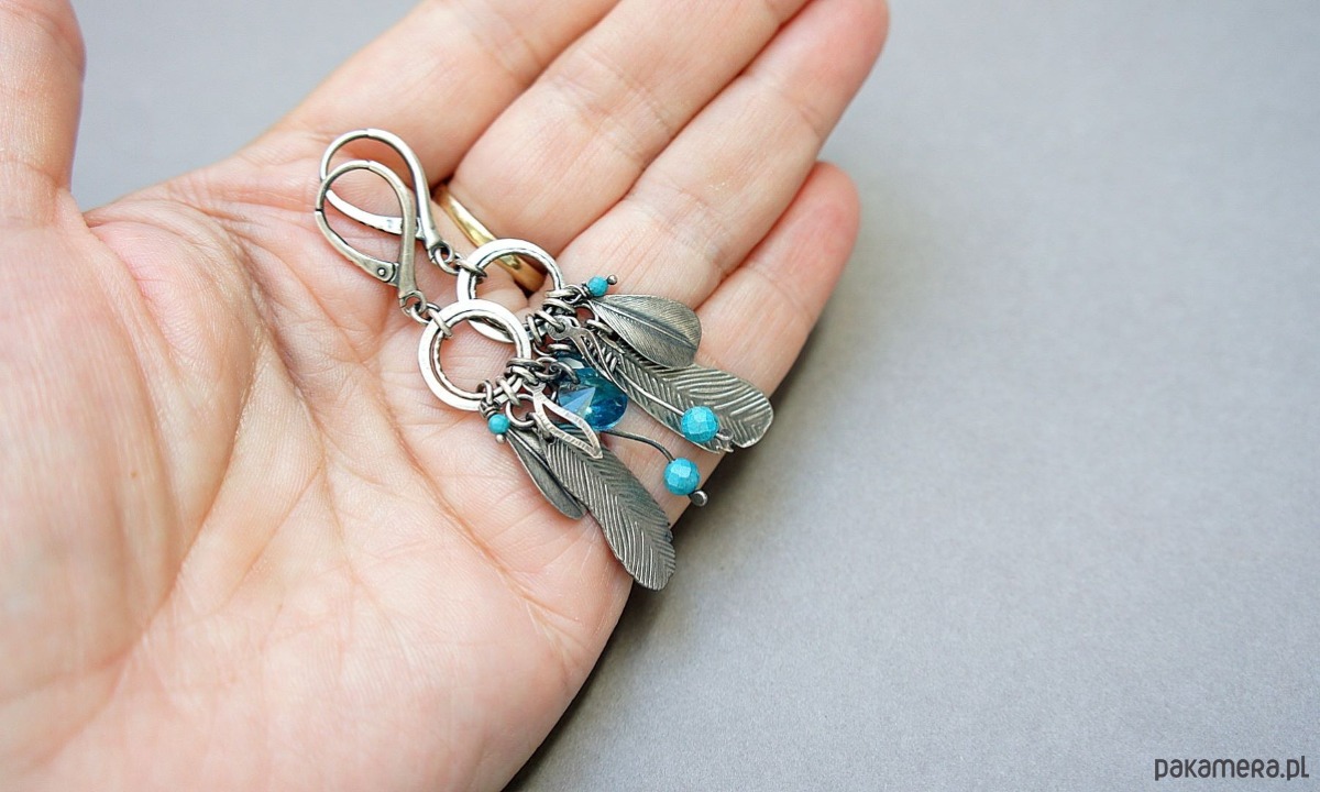 Kolczyki wykonane ze srebra [pr. 925] w połączeniu z kryształkami [8mm], fasetowanymi kuleczkami magnezytu [4mm i 2mm] oraz srebrnymi piórkami. Całość oksydowana i przetarta. Całkowita długość kolczyków 6,4cm. Biżuteria ozdobnie zapakowana.