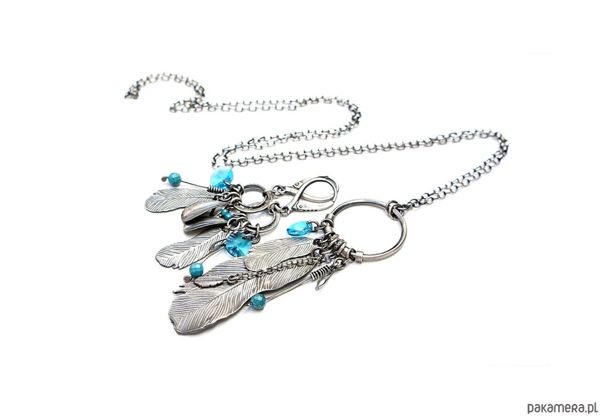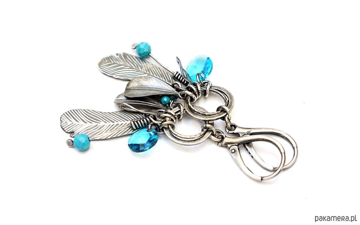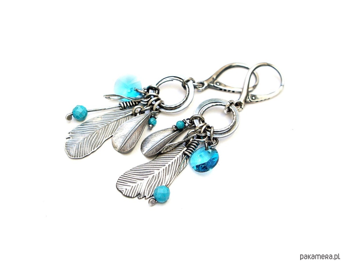 Kolczyki wykonane ze srebra [pr. 925] w połączeniu z kryształkami [8mm], fasetowanymi kuleczkami magnezytu [4mm i 2mm] oraz srebrnymi piórkami. Całość oksydowana i przetarta. Całkowita długość kolczyków 6,4cm. Biżuteria ozdobnie zapakowana.