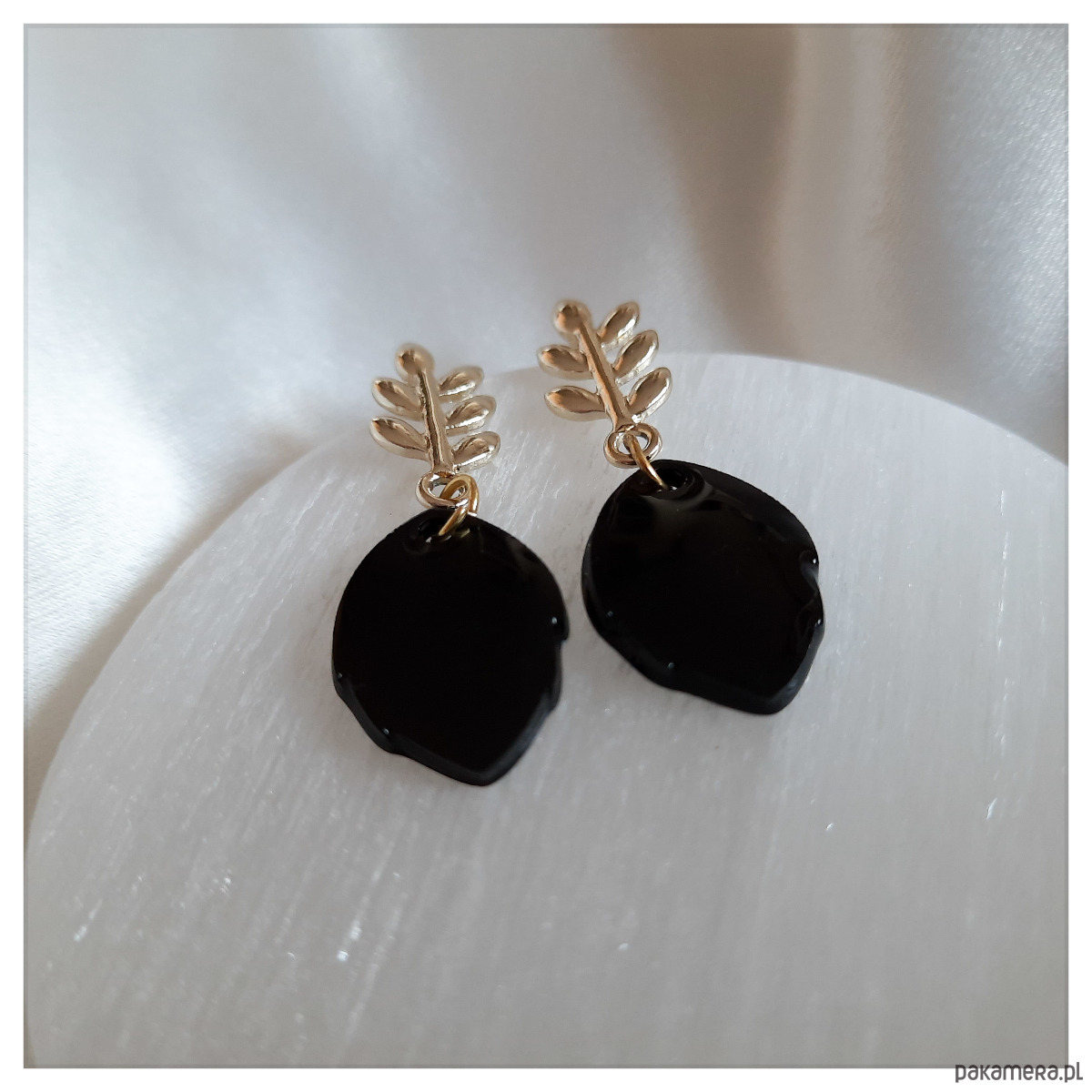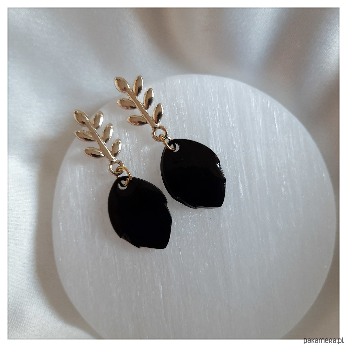 Czarno-złote małe kolczyki listki z żywicy epoksydowej.