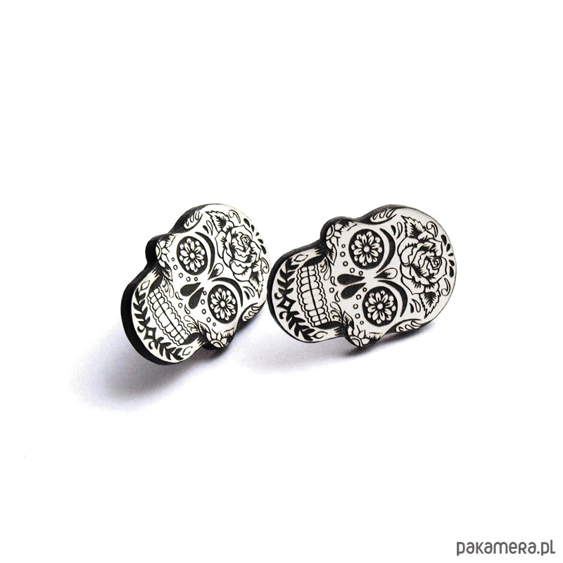 Lekkie kolczyki-sztyfty w kolorze białym wykonany z wytrzymałego materiału z grawerowanym motywem. Wielkość ok 2cm. Wkrętki silikonowe- więc nie uczulają.