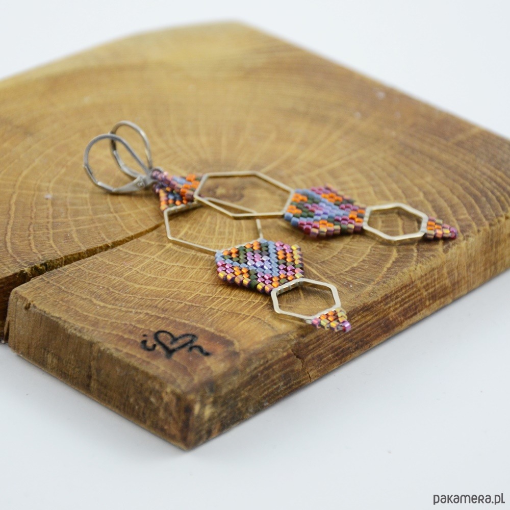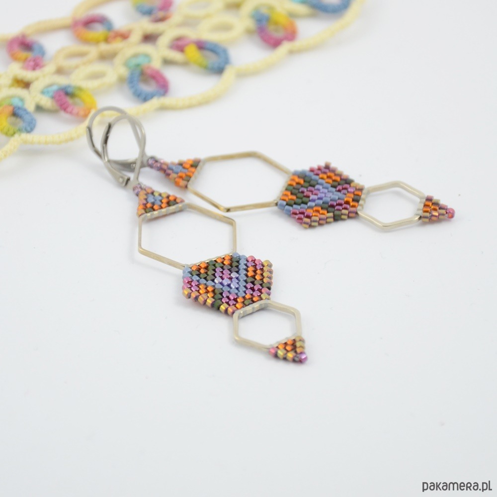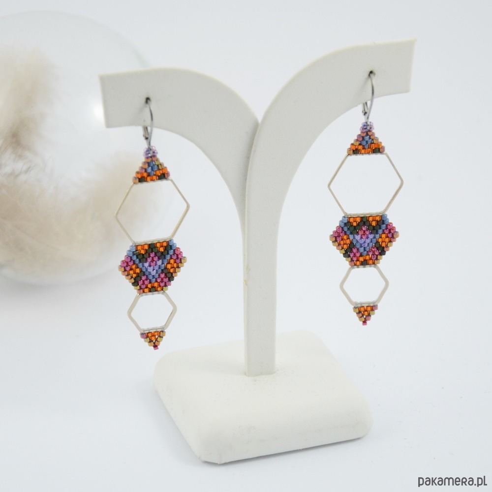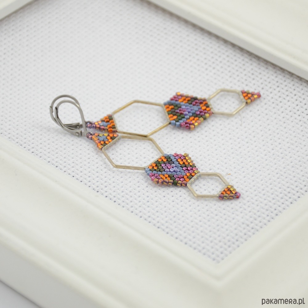 Ultralekkie kolczyki w nowoczesnej odsłonie wykonane z użyciem metalowych, geometrycznych baz. Kształty łączące bazy wyplecione z najwyższej jakości japońskich koralików Toho Treasure. Bigle ze stali chirurgicznej. Długość kolczyka 6 cm, w najszerszym miejscu 2 cm.