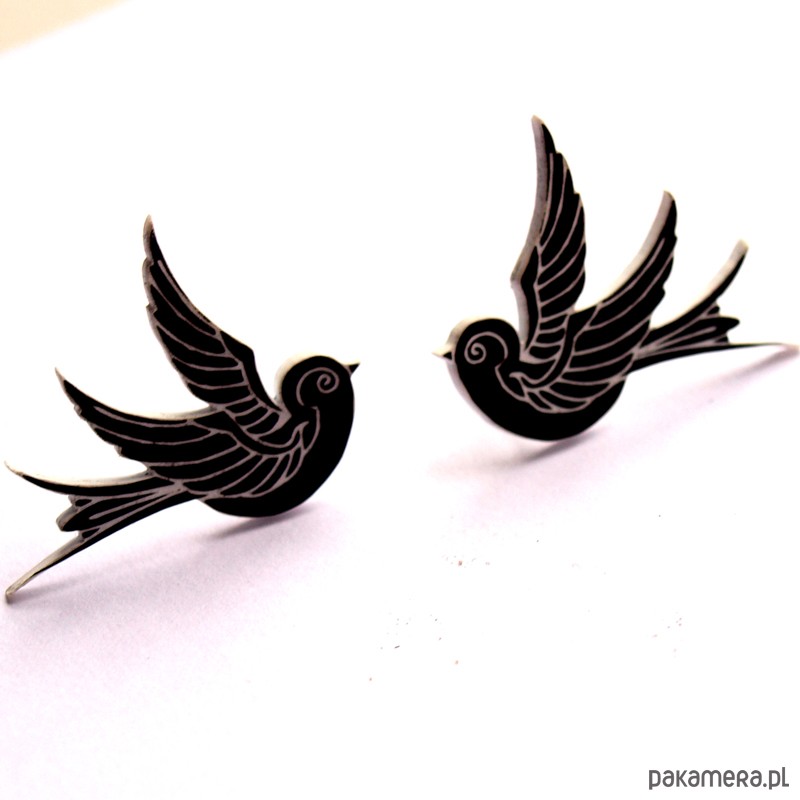 Lekkie kolczyki-sztyfty w kolorze czarnym wykonany z wytrzymałego materiału z motywem jaskółek. Wielkość jaskółek ok 2,5cm. Sztyfty bez niklu.