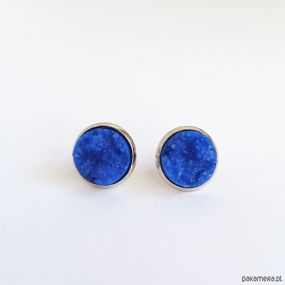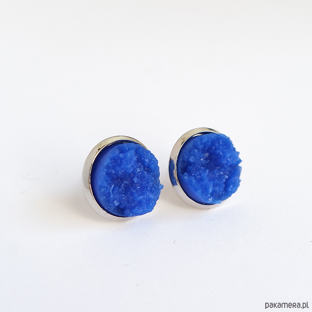 Niezwykłe, subtelne, małe kolczyki sztyfty z kaboszonem z żywicy - druzy w chabrowym odcieniu.