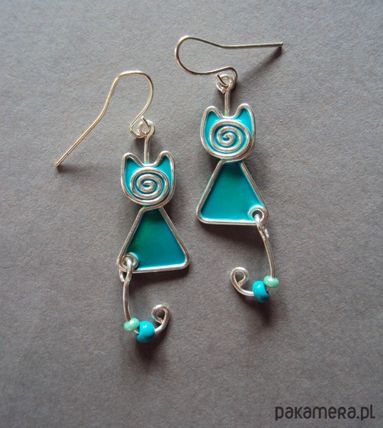 Śliczne i totalnie unikatowe kolczyki kotki w odcieniach turkusu, od podstaw wykonane ręcznie autorską techniką artystyczną.