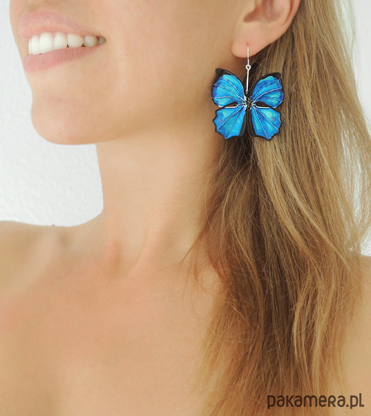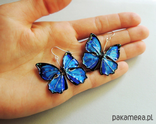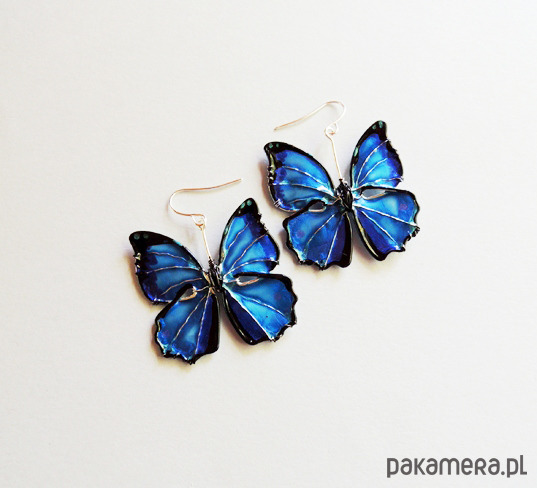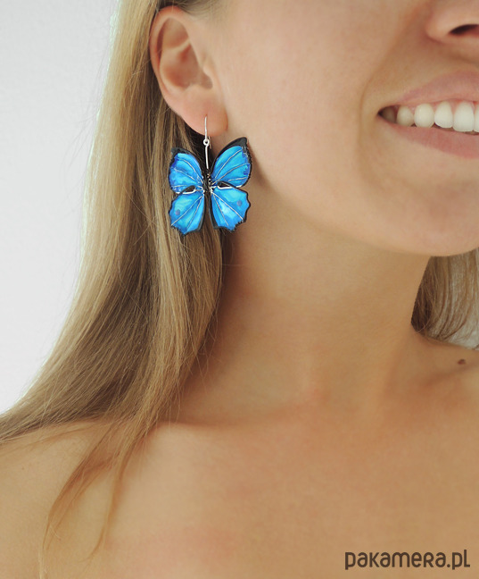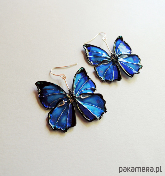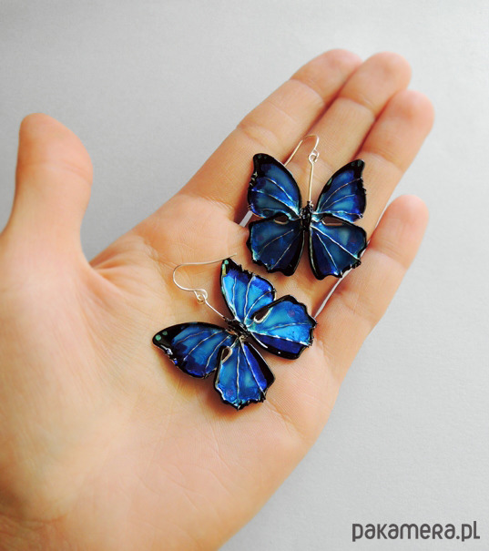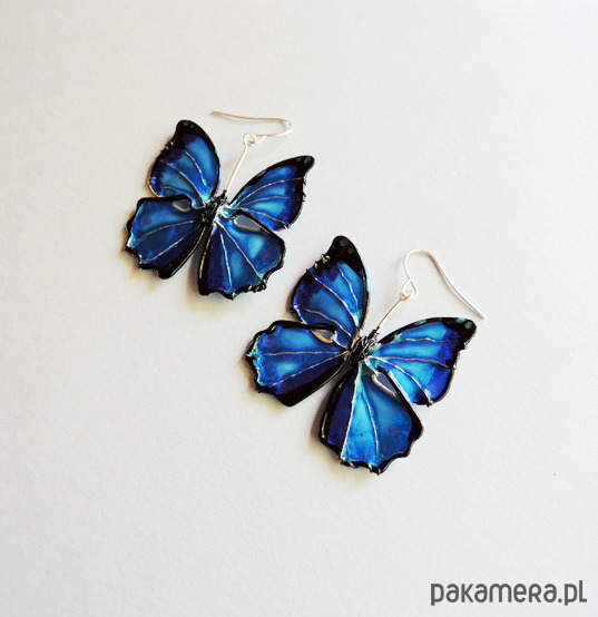 Unikatowe kolczyki motyle w odcieniach niebieskiego - kobaltowego, turkusu i szafirowego, od podstaw wykonane ręcznie autorską techniką łączoną z wirewrapping. Motyle uwielbiają światło! Niczym kamienie szlachetne mienią się, błyszczą i "świecą" pod wpływem jego promieni. Metale użyte do wykonania kolczyków nie zawierają niklu, zaś bigle (zapięcia) zostały wykonane ze stali chirurgicznej, dzięki czemu noszenie jest całkowicie bezpieczne dla alergików i nie uczula. Kolczyki są zaskakująco lekkie, prawie niewyczuwalne podczas noszenia. Serdecznie polecam