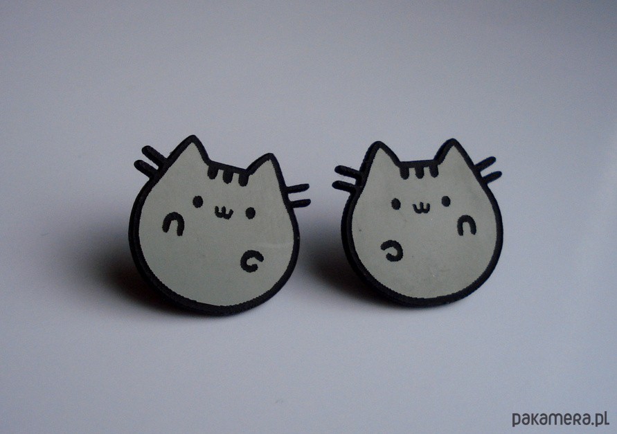 Kolczyki wykonane z tworzywa sztucznego metodą grawerską, z kultową postacią kota pusheena. Wymiary kolczyka średnica 1,9 cm