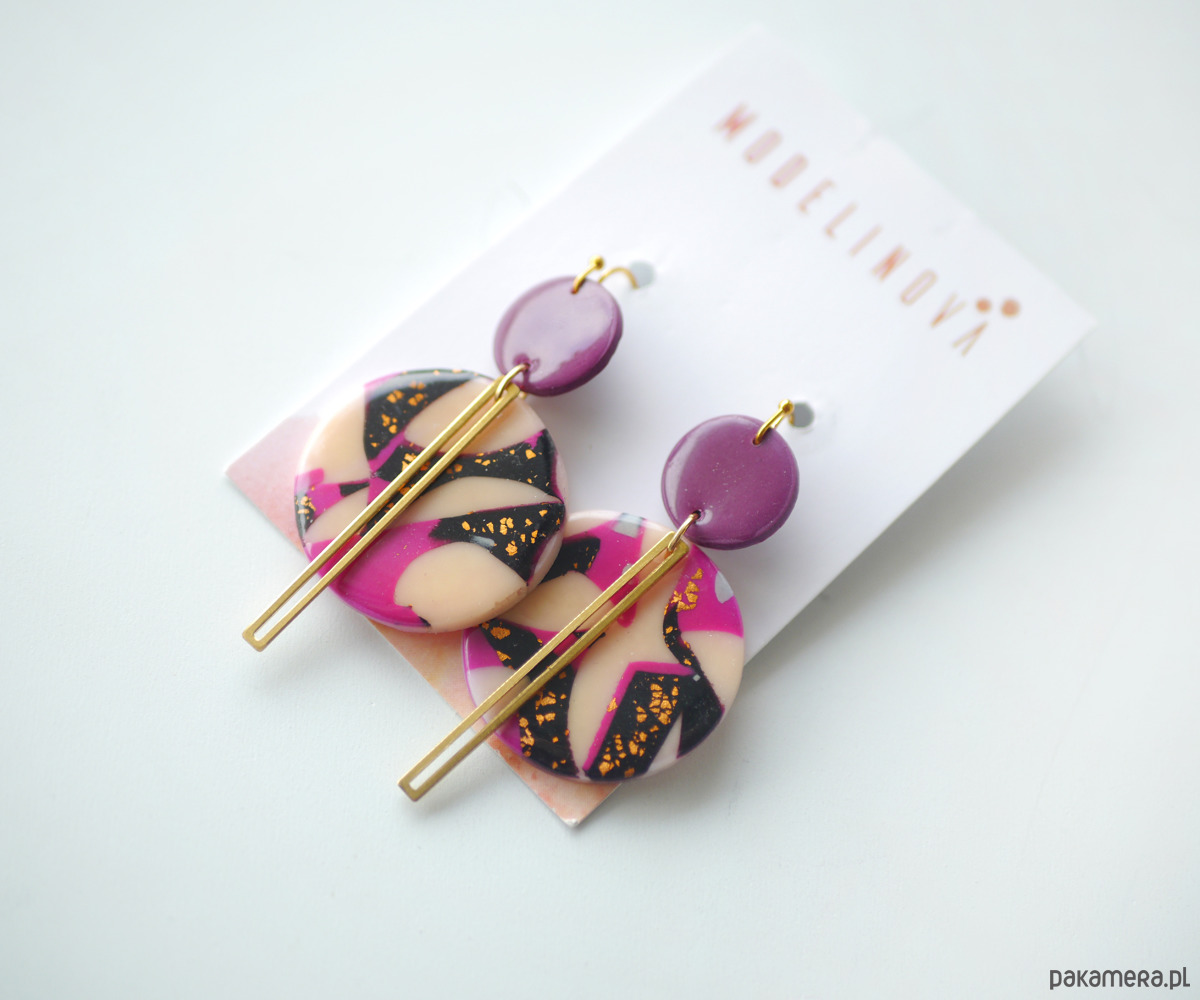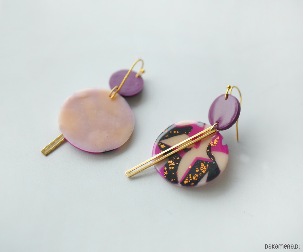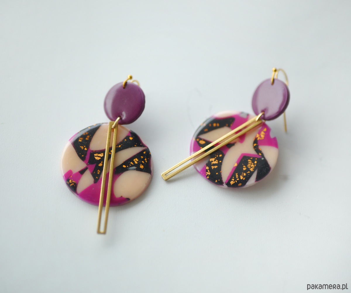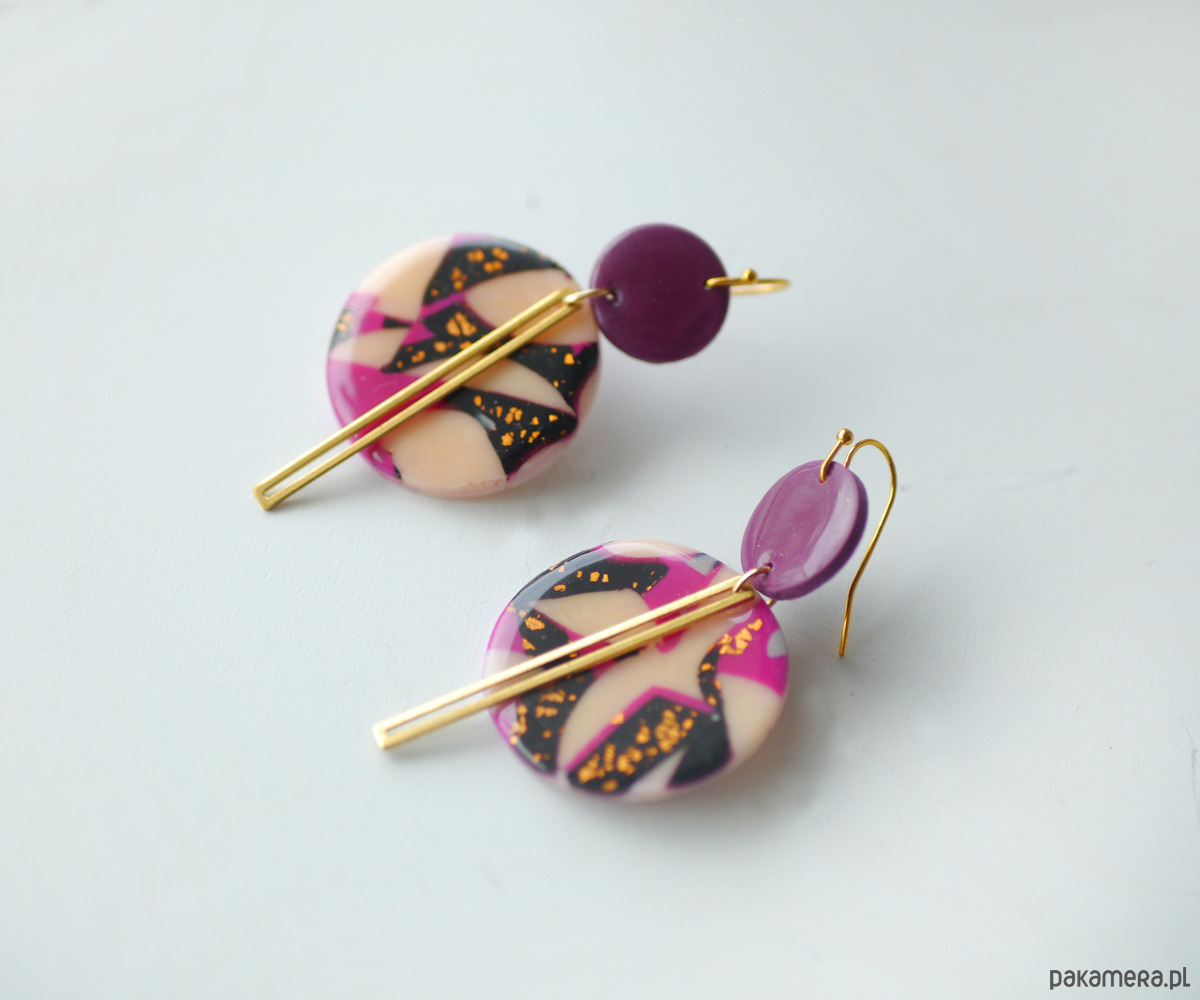 Każdy kolorowy element jest wykonany ręcznie, częściowo przy użyciu szlagmetalu w kolorze złota, , a kolczyki dodatkowo urozmaicone są podłużnym elementem z mosiądzu.