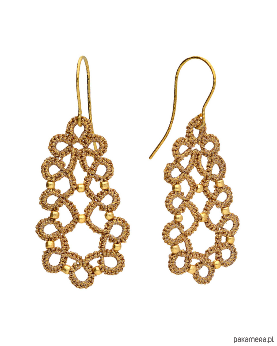 Ręcznie zrobione, koronkowe kolczyki frywolitki, z wplecionymi w nie kryształkami w kolorze złota. Same kolczyki wyplecione są z błyszczącej, złotej nici.