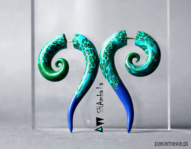 Dzikie tulejki - panterki. Szałowe, oryginalne, etniczne:) Wykonane zostały z tworzywa sztucznego i srebra. Niezwykle pomysłowe, fantazyjnie prezentują się na uchu. Wymiary tulejek to ok. 3,7 cm na 6 cm. Gorąco polecam:)