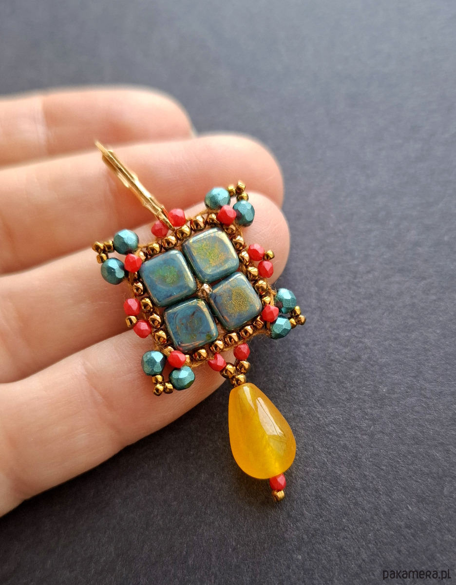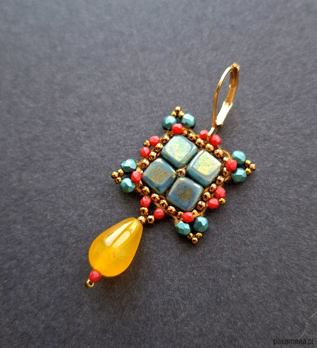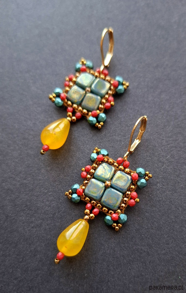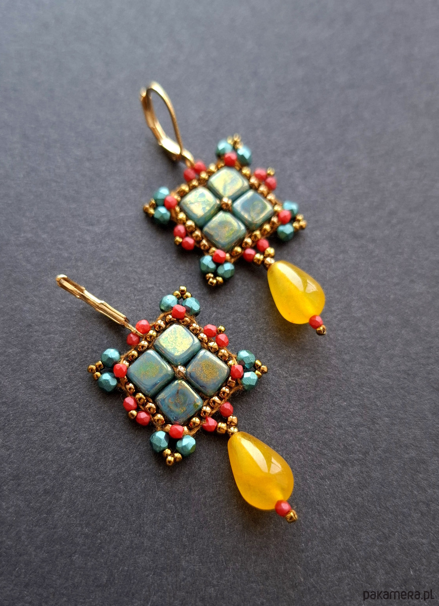 Kolczyki wiszące, wykonane techniką swoistego haftu drobnymi, szklanymi koralikami w połączeniu z żółtymi kroplami jadeitu. Dwustronne, podwieszone na pozłacanych i nieuczulających biglach typy angielskiego. Wymiary - długość wraz z zapięciem: 5,5 cm, szerokość max. 2,2 mm. Wykonane w jedynym egzemplarzu.