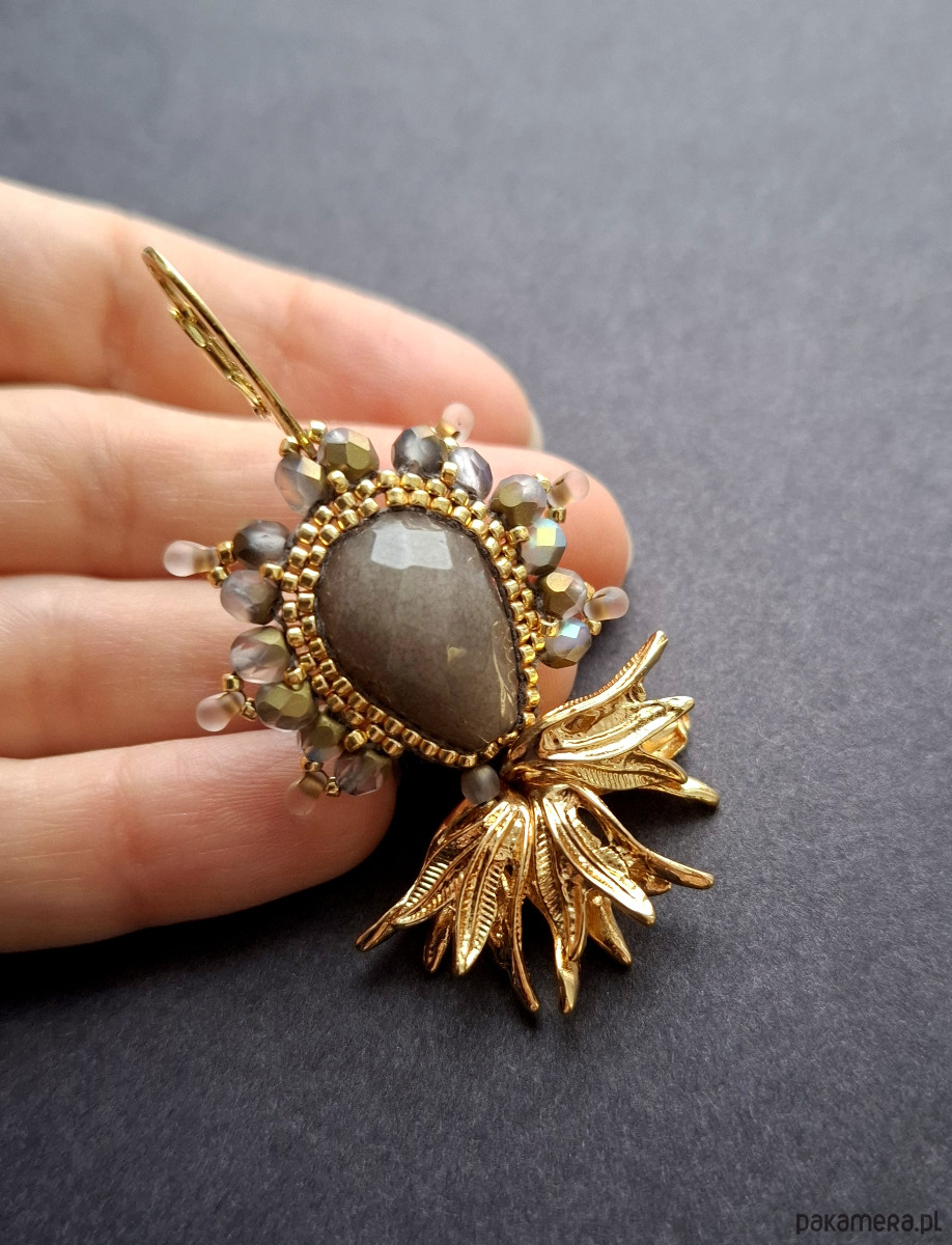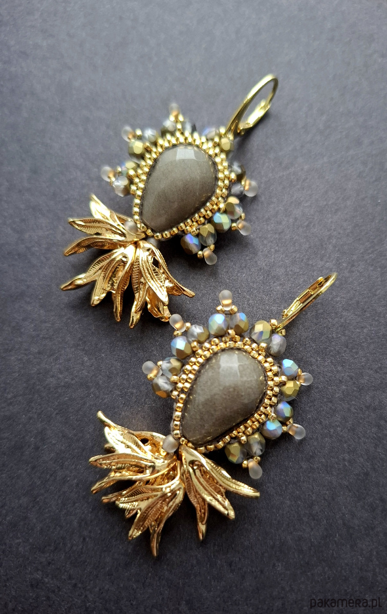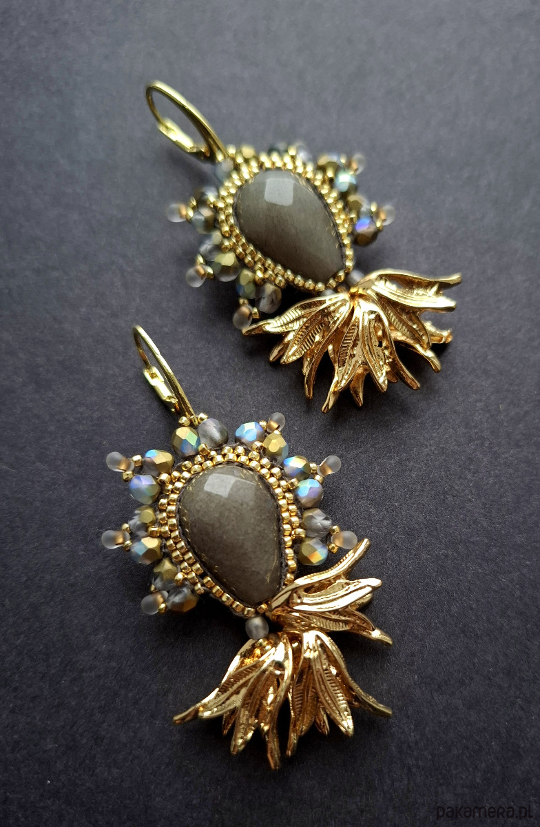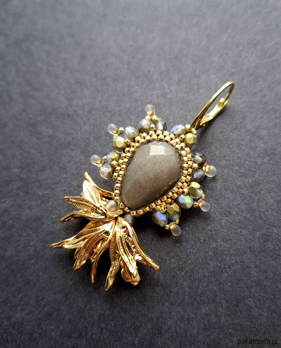 Efektowne kolczyki wiszące wykonane swoistą techniką haftu drobnymi, szklanymi koralikami w połączeniu z szarymi, szlifowanymi jadeitami oraz ozdobnymi elementami metalowymi. Dwustronne, podwieszone na pozłacanych, nieuczulających biglach typu angielskiego. Wymiary: długość wraz z zapięciem: 6,3 cm; szerokość max. 3,5 cm. Wykonane w jedynym egzemplarzu.