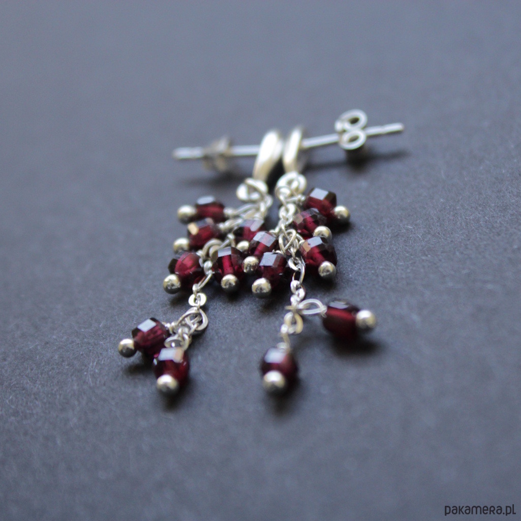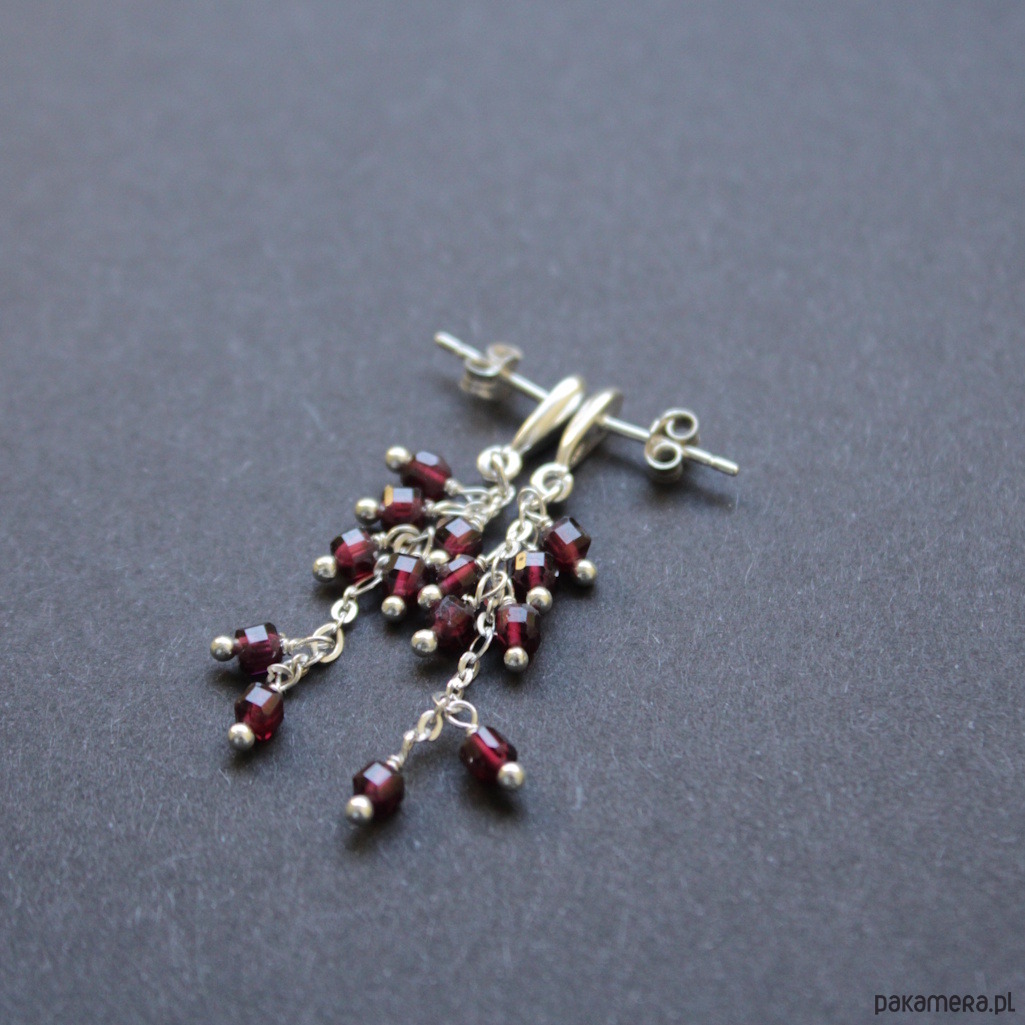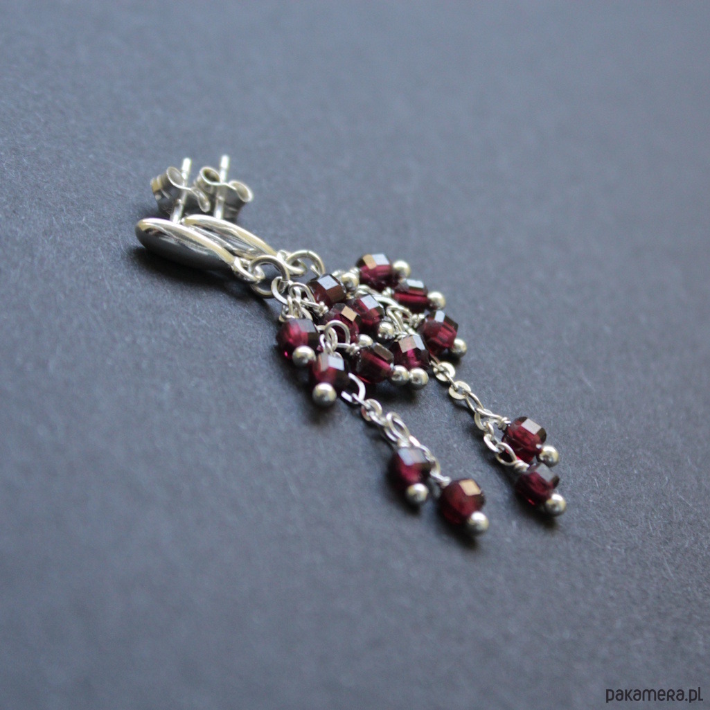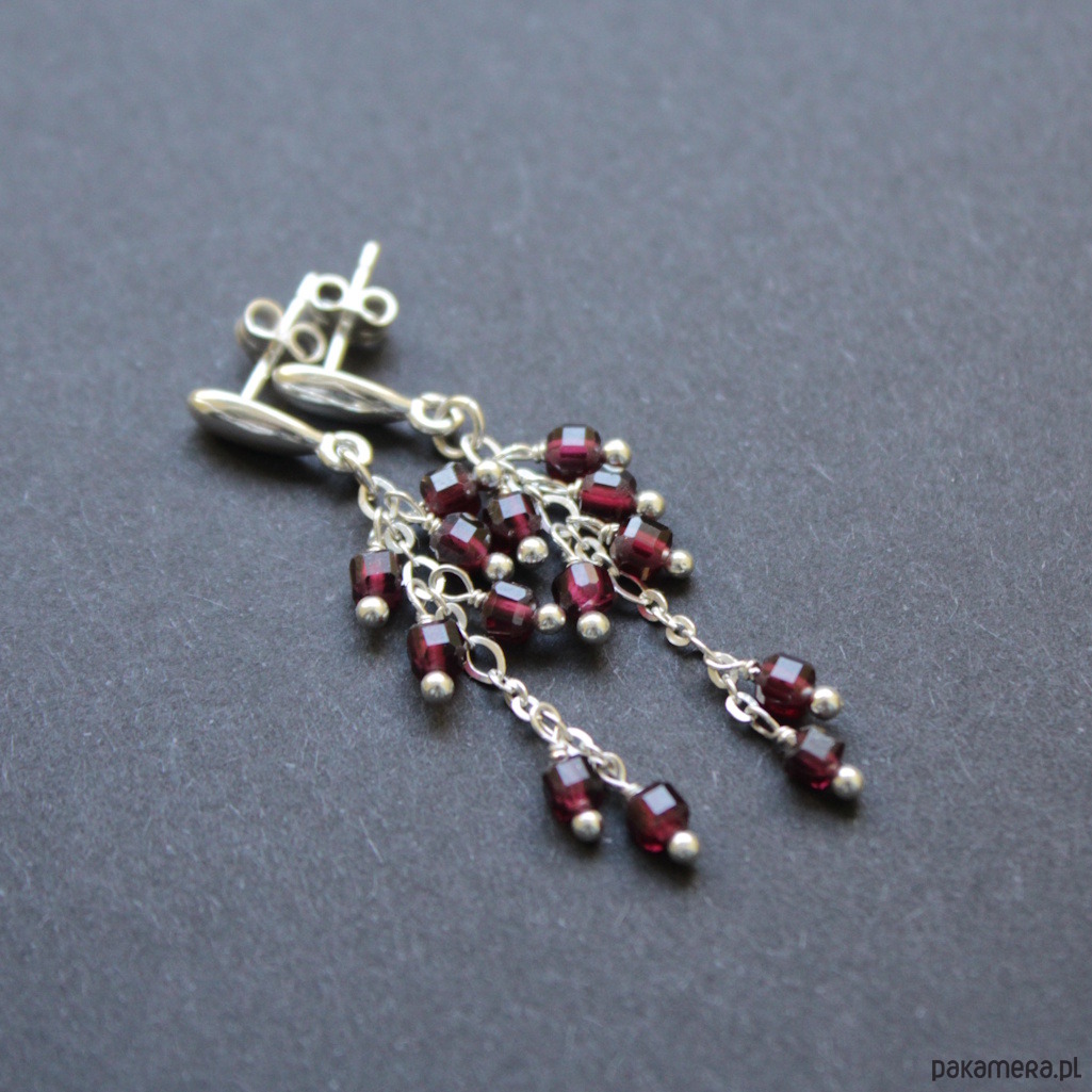Kolczyki wykonane zostały ze srebra próby 925 oraz fasetowanych kosteczek granatów wielkości 0,4 cm.