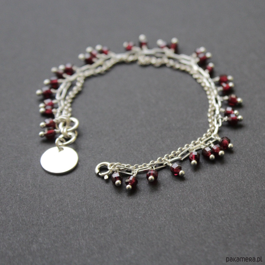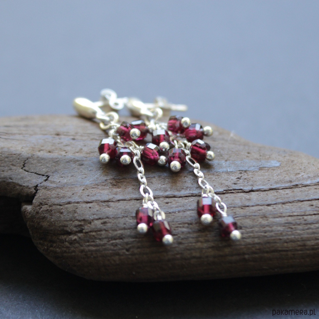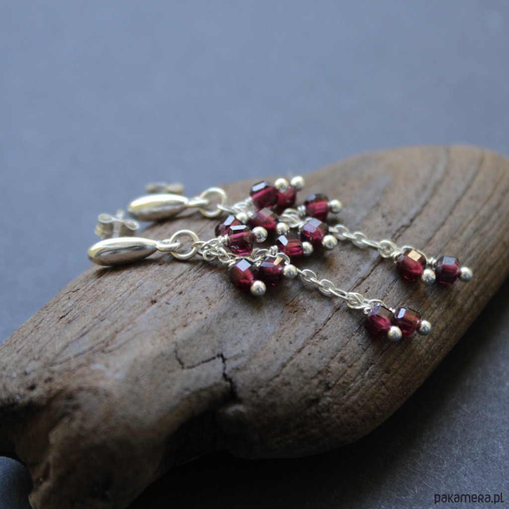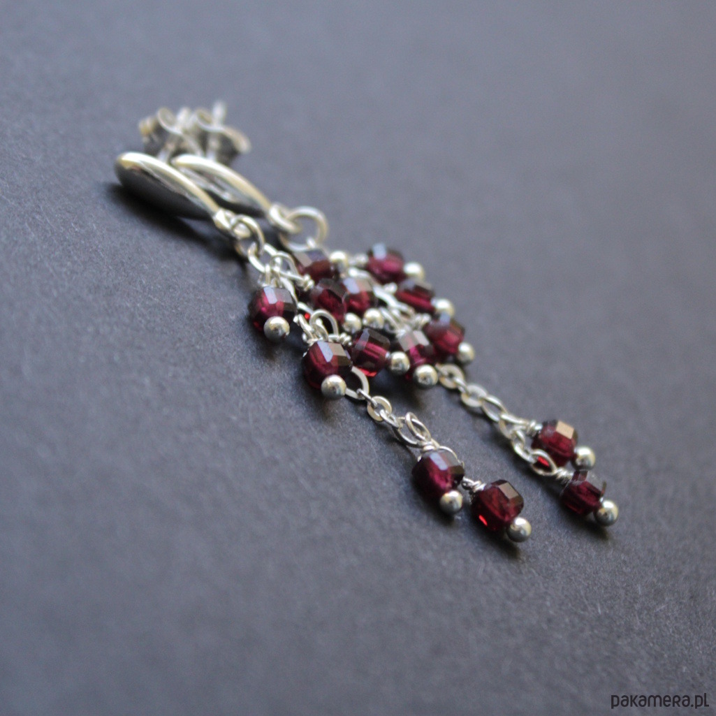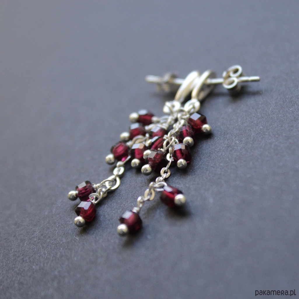 Kolczyki wykonane zostały ze srebra próby 925 oraz fasetowanych kosteczek granatów wielkości 0,4 cm.