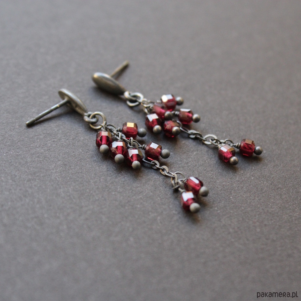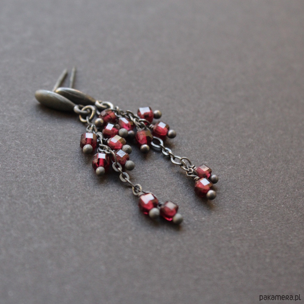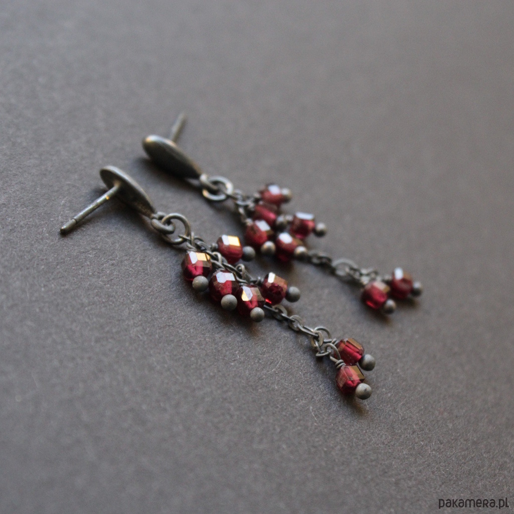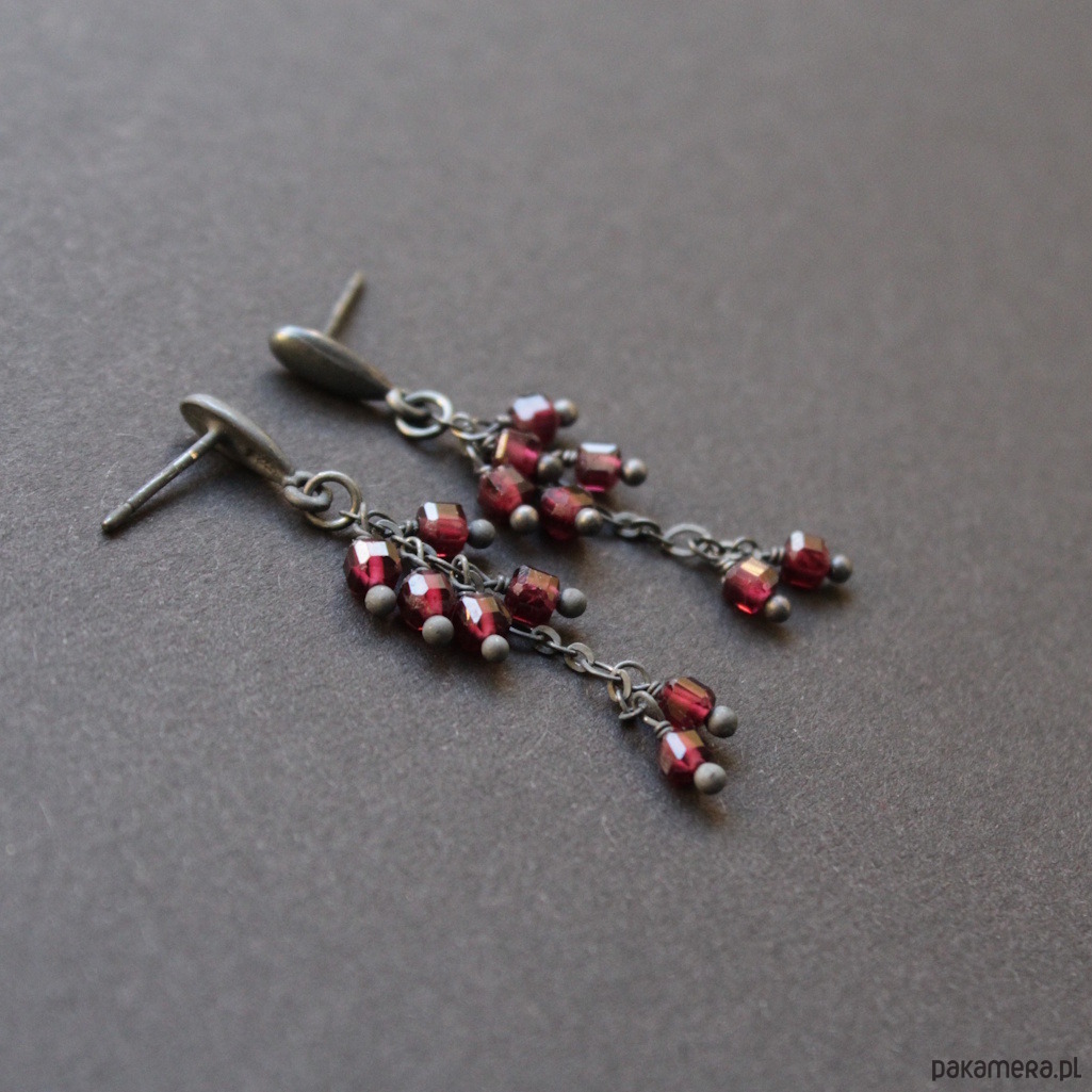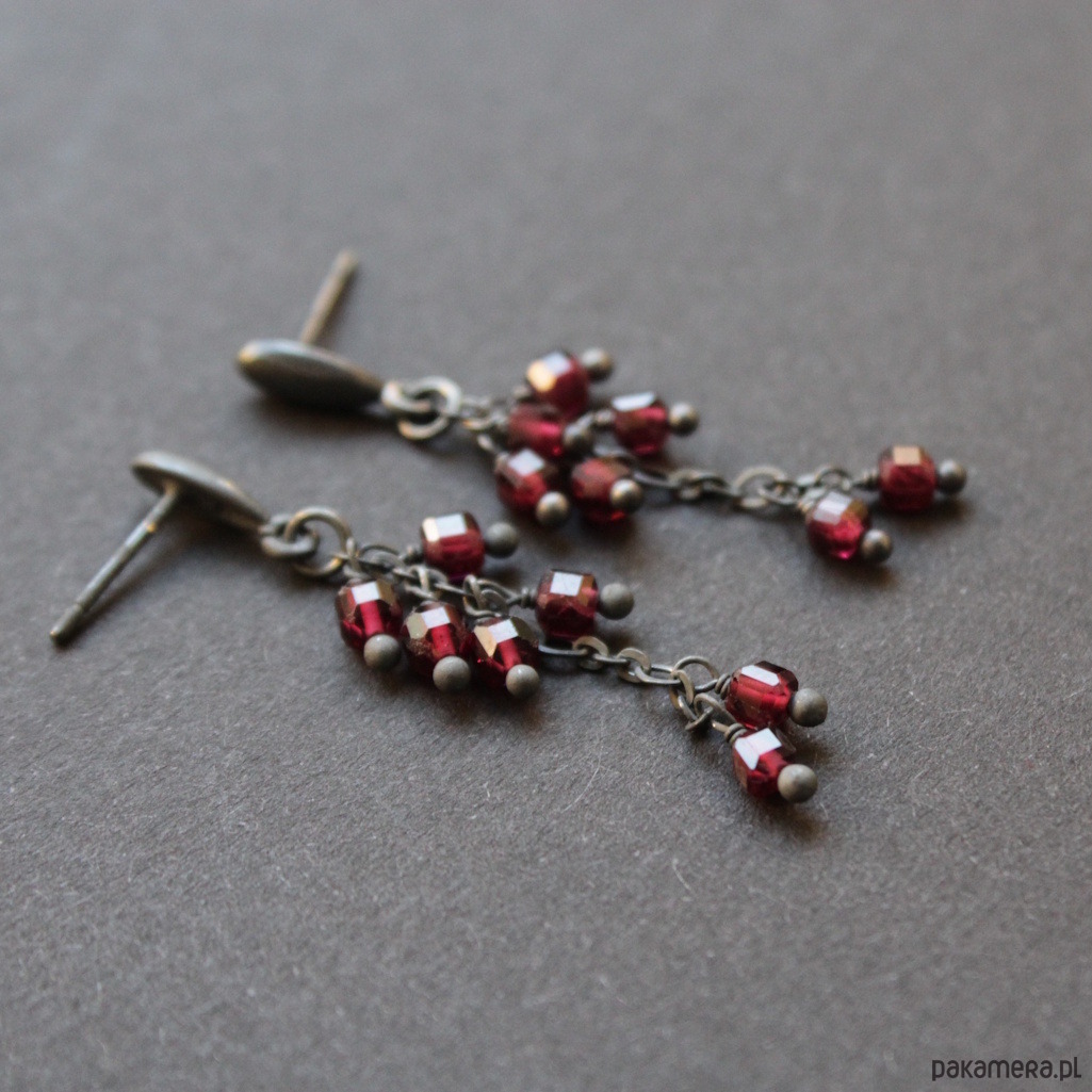 Kolczyki wykonane zostały z oksydowanego srebra próby 925 oraz fasetowanych kosteczek granatów wielkości 0,4 cm.